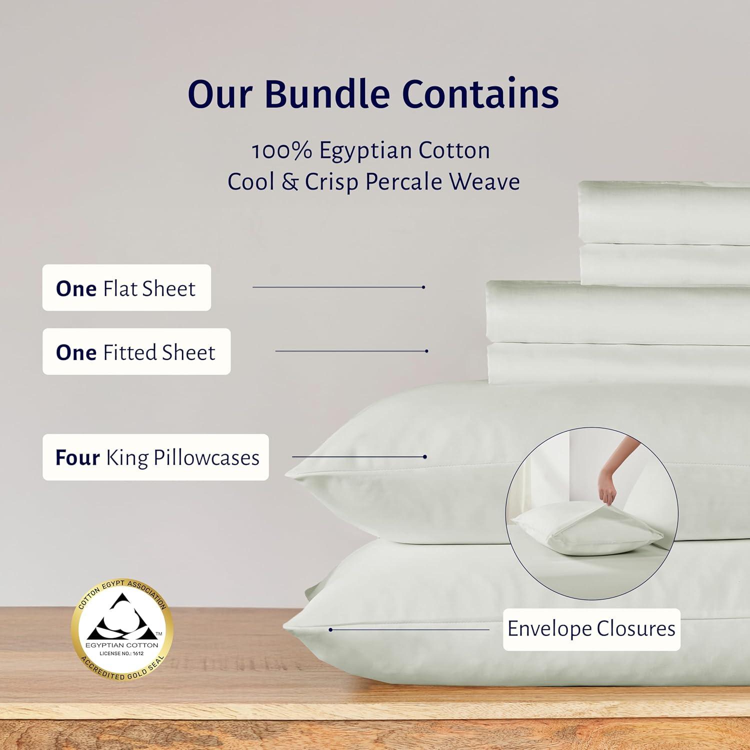 Transform your sleep with our luxurious Egyptian percale bedding bundle, featuring an award-winning sheet set and matching pillowcases. Meticulously woven from 100% certified Egyptian cotton in a crisp percale weave, these sheets and pillowcases offer exceptional quality, a smooth matte finish, and breathable coolness—perfect for hot sleepers. Bearing the Official Gold Seal of Authenticity from the Egyptian Cotton Association, they are machine washable, maintain their crisp feel, and are OEKO-TEX Standard 100 certified for safety and sustainability. The set includes a flat sheet, a deep pocket fitted sheet with anti-skid elastic, and pillowcases with envelope closures for a secure fit. The pillowcases provide five-star comfort, are moisture-wicking, temperature-regulating, and can withstand years of washing without shrinking or fading. Produced in our family-owned and operated factory in India, each piece undergoes rigorous quality checks to maintain unmatched quality.