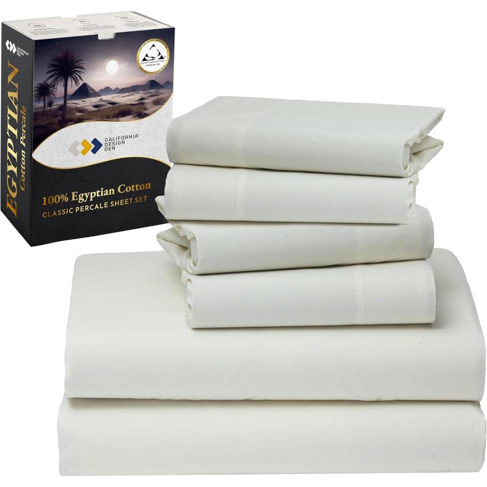 100% Egyptian Cotton Percale Bundle – 6 Piece California King Size Sheet Set with 4 Pillowcases – Ivory