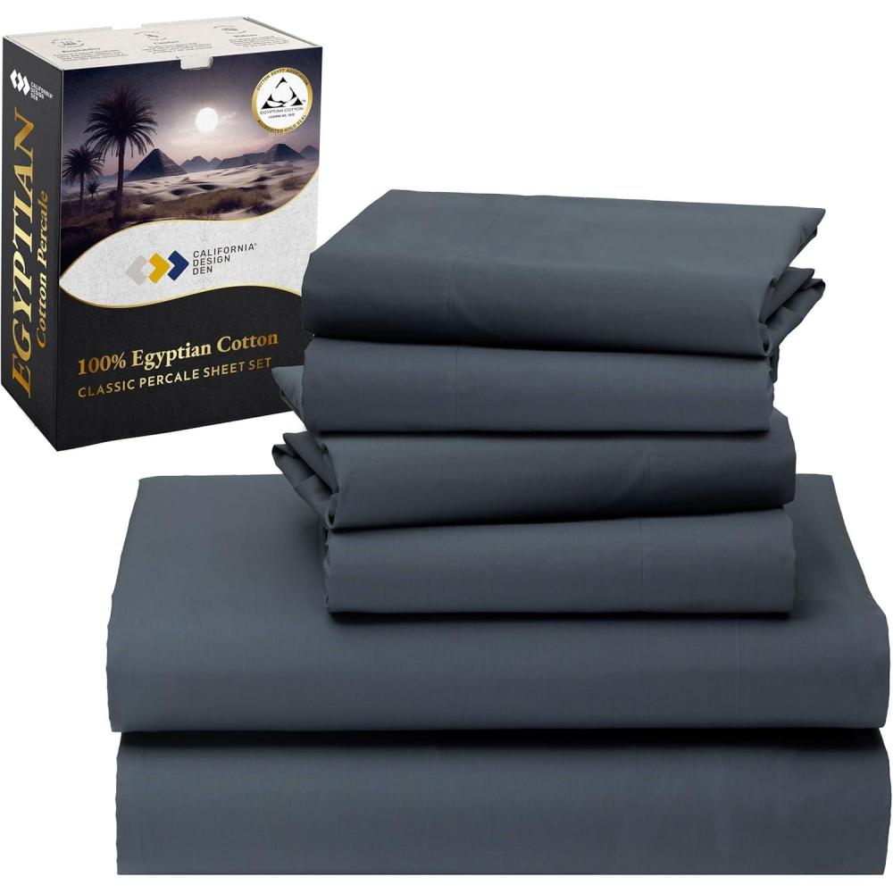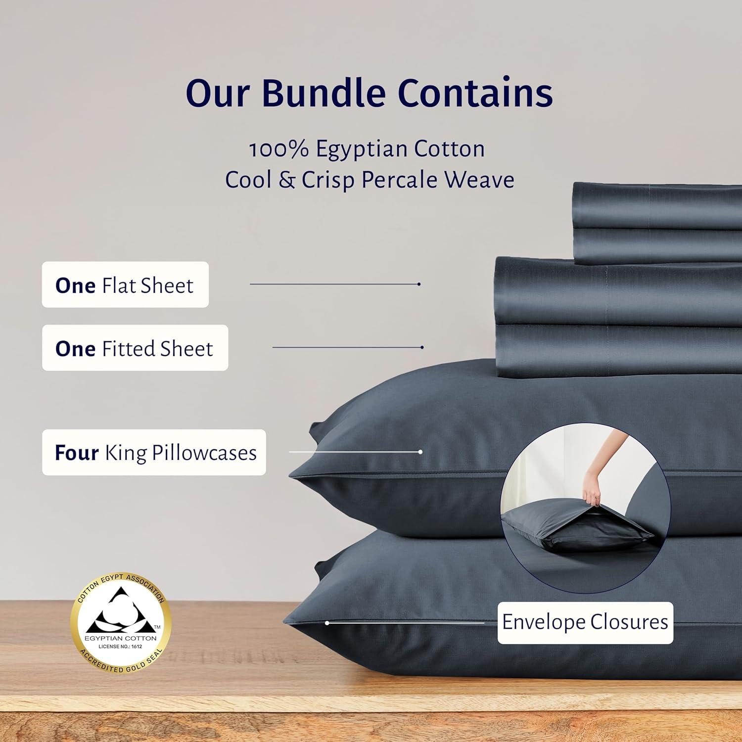 Transform your sleep with our luxurious Egyptian percale bedding bundle, featuring an award-winning sheet set and matching pillowcases. Meticulously woven from 100% certified Egyptian cotton in a crisp percale weave, these sheets and pillowcases offer exceptional quality, a smooth matte finish, and breathable coolness—perfect for hot sleepers. Bearing the Official Gold Seal of Authenticity from the Egyptian Cotton Association, they are machine washable, maintain their crisp feel, and are OEKO-TEX Standard 100 certified for safety and sustainability. The set includes a flat sheet, a deep pocket fitted sheet with anti-skid elastic, and pillowcases with envelope closures for a secure fit. The pillowcases provide five-star comfort, are moisture-wicking, temperature-regulating, and can withstand years of washing without shrinking or fading. Produced in our family-owned and operated factory in India, each piece undergoes rigorous quality checks to maintain unmatched quality.