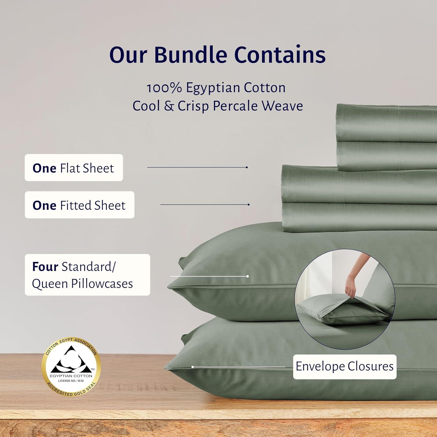 Transform your sleep with our luxurious Egyptian percale bedding bundle, featuring an award-winning sheet set and matching pillowcases. Meticulously woven from 100% certified Egyptian cotton in a crisp percale weave, these sheets and pillowcases offer exceptional quality, a smooth matte finish, and breathable coolness—perfect for hot sleepers. Bearing the Official Gold Seal of Authenticity from the Egyptian Cotton Association, they are machine washable, maintain their crisp feel, and are OEKO-TEX Standard 100 certified for safety and sustainability. The set includes a flat sheet, a deep pocket fitted sheet with anti-skid elastic, and pillowcases with envelope closures for a secure fit. The pillowcases provide five-star comfort, are moisture-wicking, temperature-regulating, and can withstand years of washing without shrinking or fading. Produced in our family-owned and operated factory in India, each piece undergoes rigorous quality checks to maintain unmatched quality.
