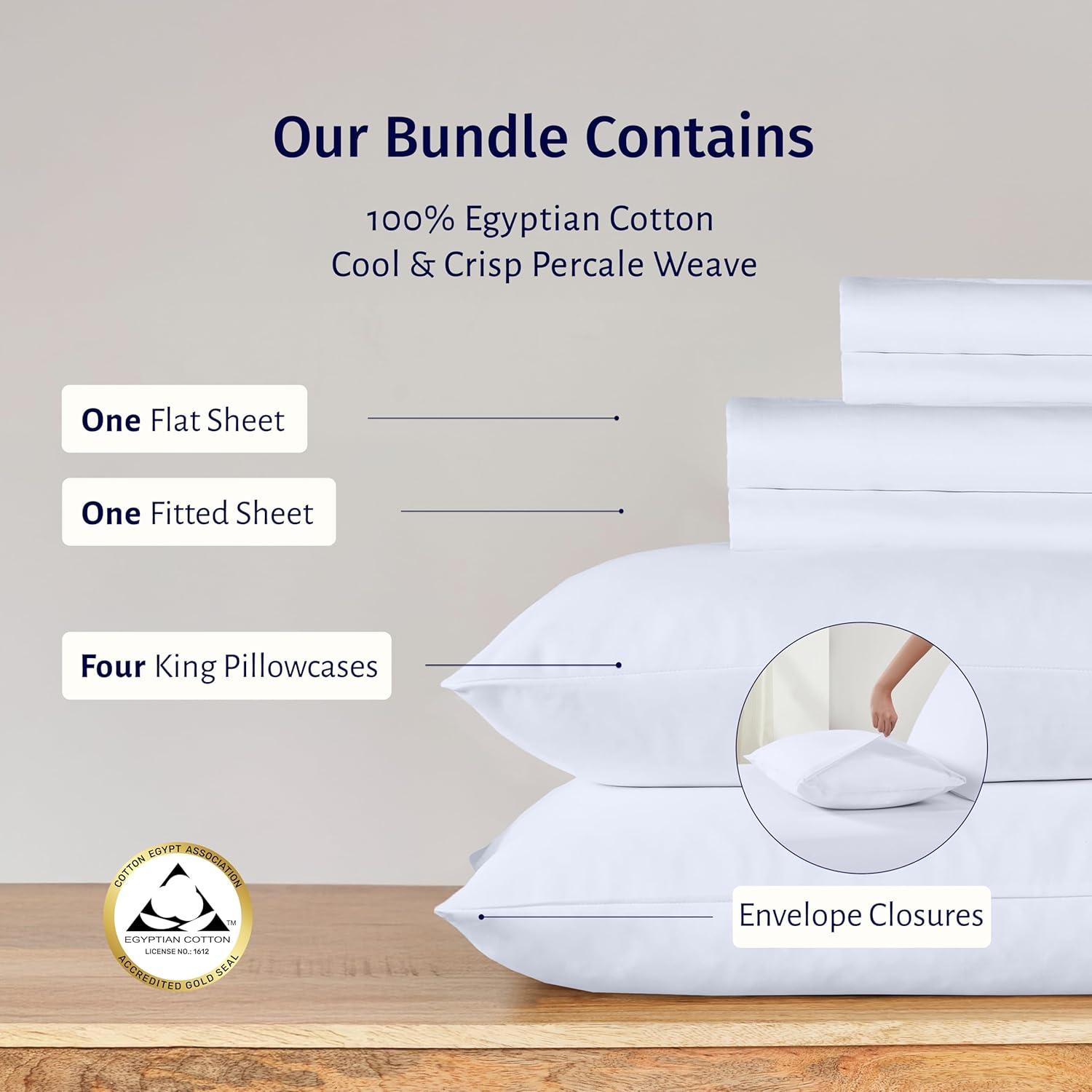 Transform your sleep with our luxurious Egyptian percale bedding bundle, featuring an award-winning sheet set and matching pillowcases. Meticulously woven from 100% certified Egyptian cotton in a crisp percale weave, these sheets and pillowcases offer exceptional quality, a smooth matte finish, and breathable coolness—perfect for hot sleepers. Bearing the Official Gold Seal of Authenticity from the Egyptian Cotton Association, they are machine washable, maintain their crisp feel, and are OEKO-TEX Standard 100 certified for safety and sustainability. The set includes a flat sheet, a deep pocket fitted sheet with anti-skid elastic, and pillowcases with envelope closures for a secure fit. The pillowcases provide five-star comfort, are moisture-wicking, temperature-regulating, and can withstand years of washing without shrinking or fading. Produced in our family-owned and operated factory in India, each piece undergoes rigorous quality checks to maintain unmatched quality.