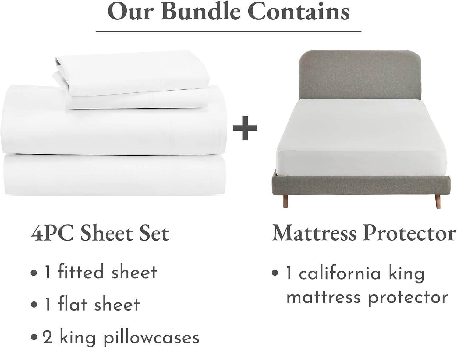 5 Piece California King Size Sheet Set and Waterproof Mattress Protector Bundle – 100% Organic Cotton Percale 4 Piece Sheet Set with 1 Mattress Protector (White)