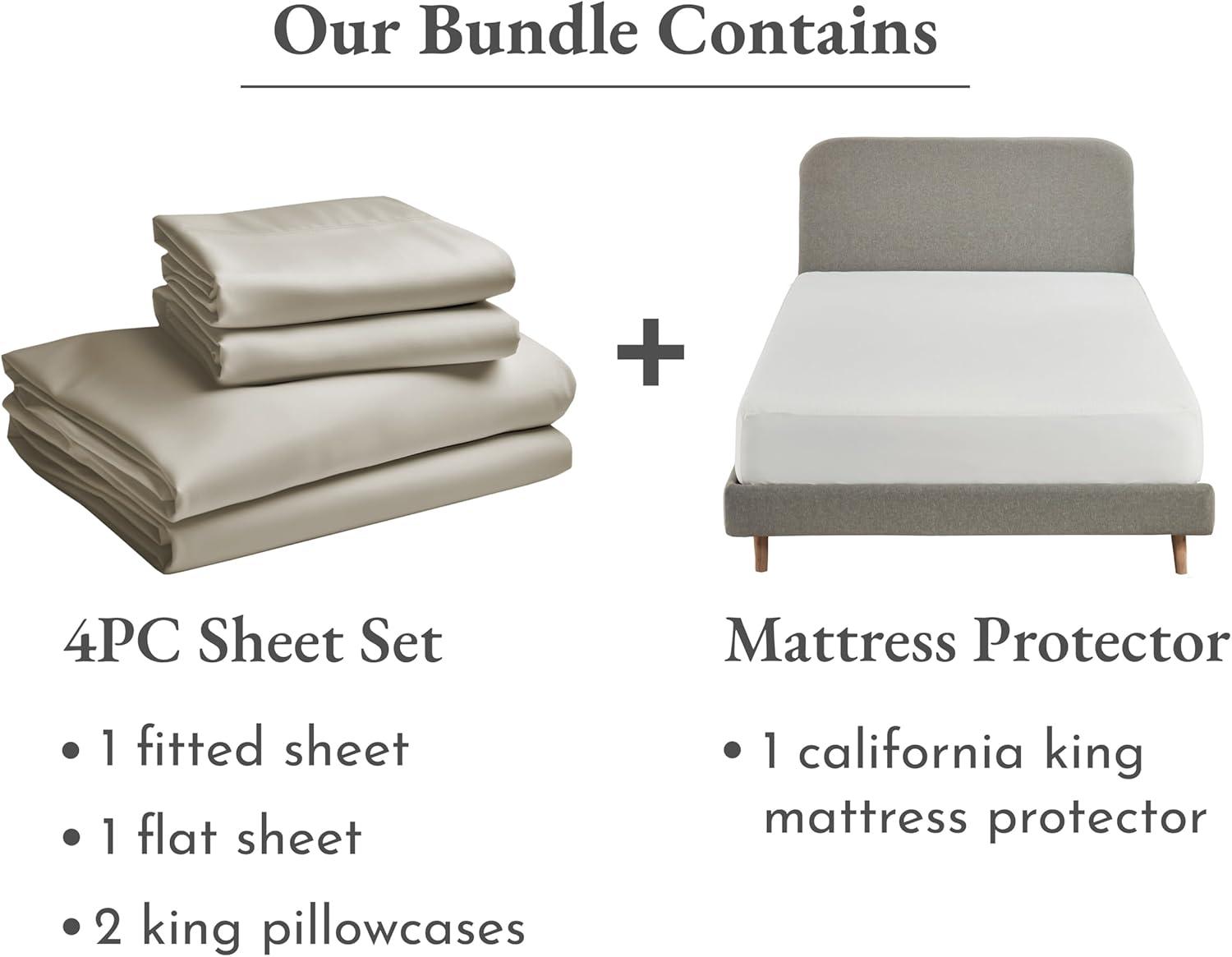 5 Piece California King Size Sheet Set (Beige) and Waterproof Mattress Protector Bundle (White) – 100% Egyptian Cotton Sateen, 4 Piece Sheet Set with 1 Mattress Protector