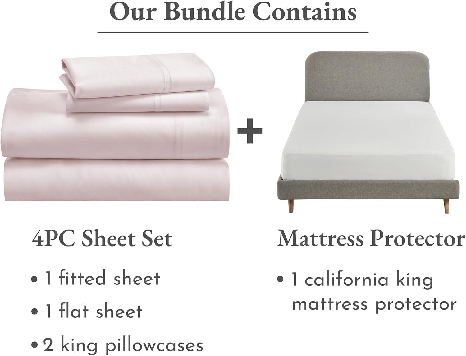 5 Piece California King Size Sheet Set (Blush Pink) and Waterproof Mattress Protector (White) Bundle - 600 Thread Count 100% Cotton Sateen, 4 Piece Sheet Set with 1 Mattress Protector