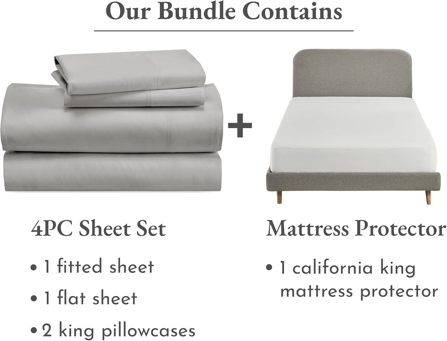 5 Piece California King Size Sheet Set (Light Grey) and Waterproof Mattress Protector (White) Bundle – 100% Organic Cotton Percale 4 Piece Sheet Set with 1 Mattress Protector