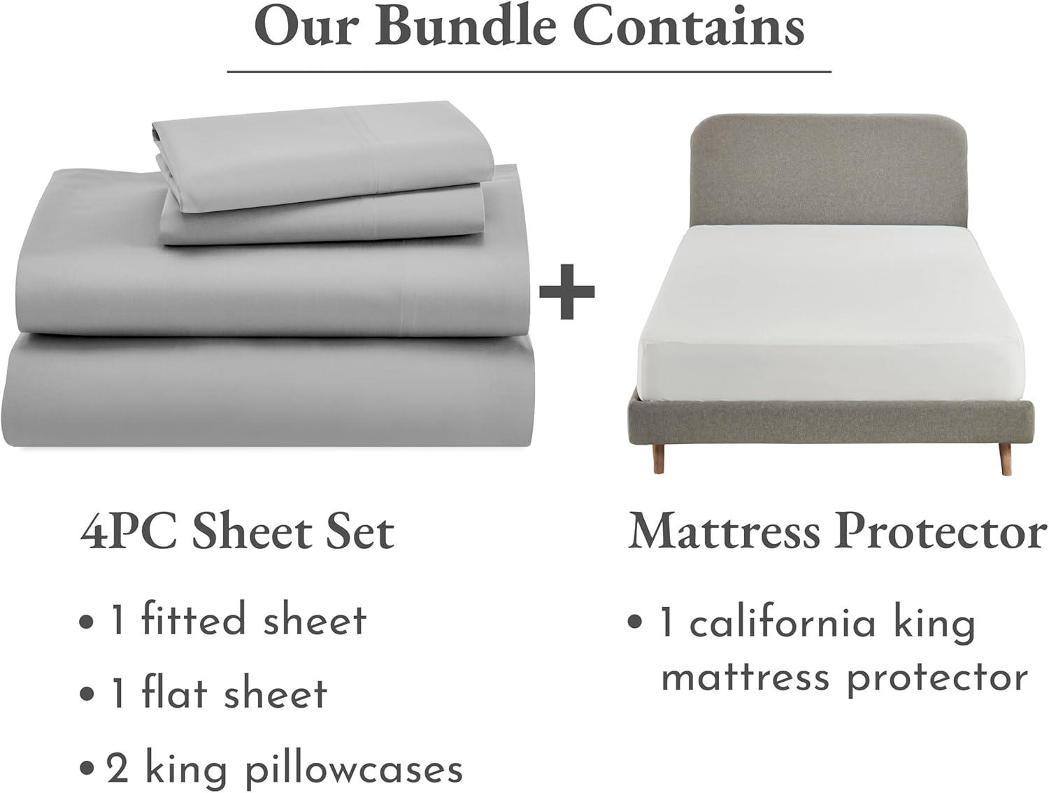 5 Piece California King Size Sheet Set (Light Grey) and Waterproof Mattress Protector (White) Bundle - 600 Thread Count 100% Cotton Sateen, 4 Piece Sheet Set with 1 Mattress Protector