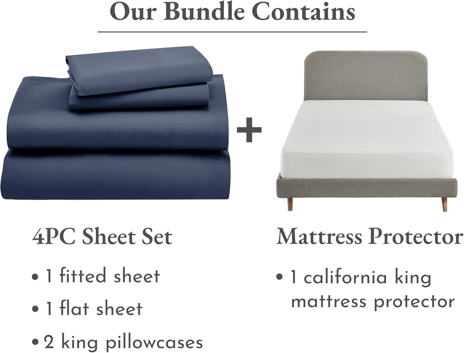 5 Piece California King Size Sheet Set (Royal Navy Blue) and Waterproof Mattress Protector (White) Bundle - 600 Thread Count 100% Cotton Sateen, 4 Piece Sheet Set with 1 Mattress Protector