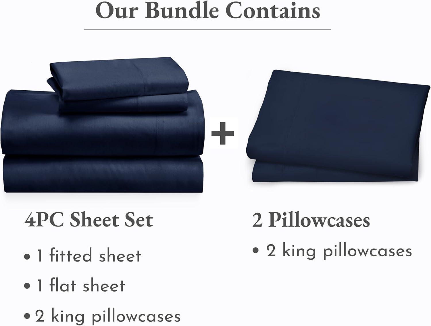 Experience eco-conscious luxury with our rayon from bamboo bedding bundle. Crafted from 100% rayon from bamboo, this cal king-size sheet set and king-size pillowcases offer exceptional softness, cooling, and moisture-wicking properties for a comfortable night's sleep. This 6 piece bundle set includes a flat sheet, a deep pocket fitted sheet with sturdy elastic for mattresses 8 to 16 inches deep, and 4 king pillowcases with an envelope closure. These sheets are durable, easy to care for, and maintain their silky smooth drape without shrinking or fading. OEKO-TEX certified, they ensure a safe sleep environment. The pillowcases feel like real silk, minimizing friction for smoother skin and frizz-free hair. They are perfectly sized for standard and queen pillows and feature an envelope closure to keep pillows in place. Enjoy the cooling comfort of rayon fabric and make a sustainable choice for the environment. Enhance your sleep with this rayon from bamboo bedding bundle, backed by a dedicated customer care team with every purchase.