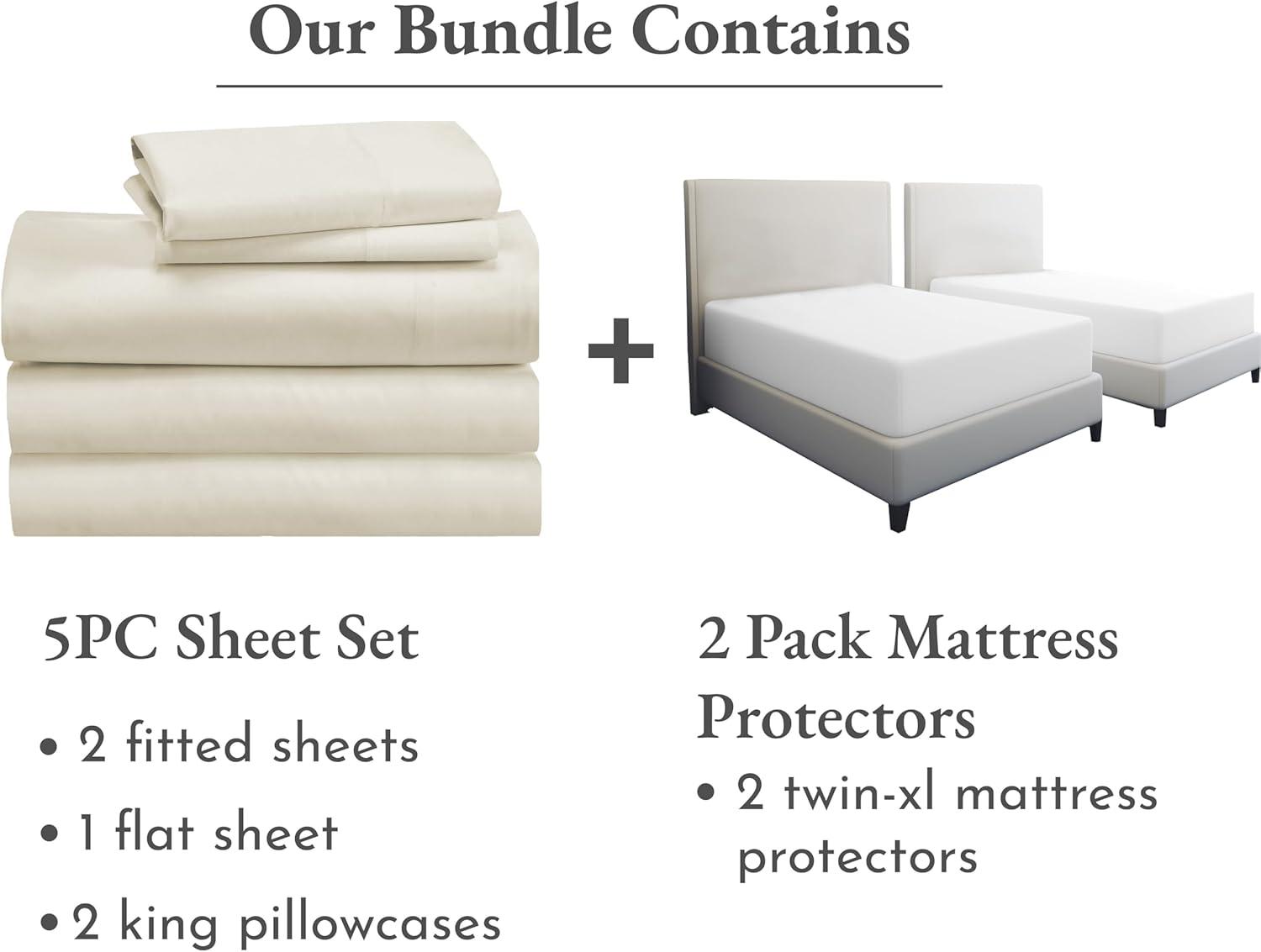 7 Piece Split King Sheet Set Size Sheet Set (Creamy Beige) and Waterproof Mattress Protector (White) Bundle - 500 Thread Count 100% Cotton Sateen, 5 Piece Sheet Set with 2 Mattress Protectors