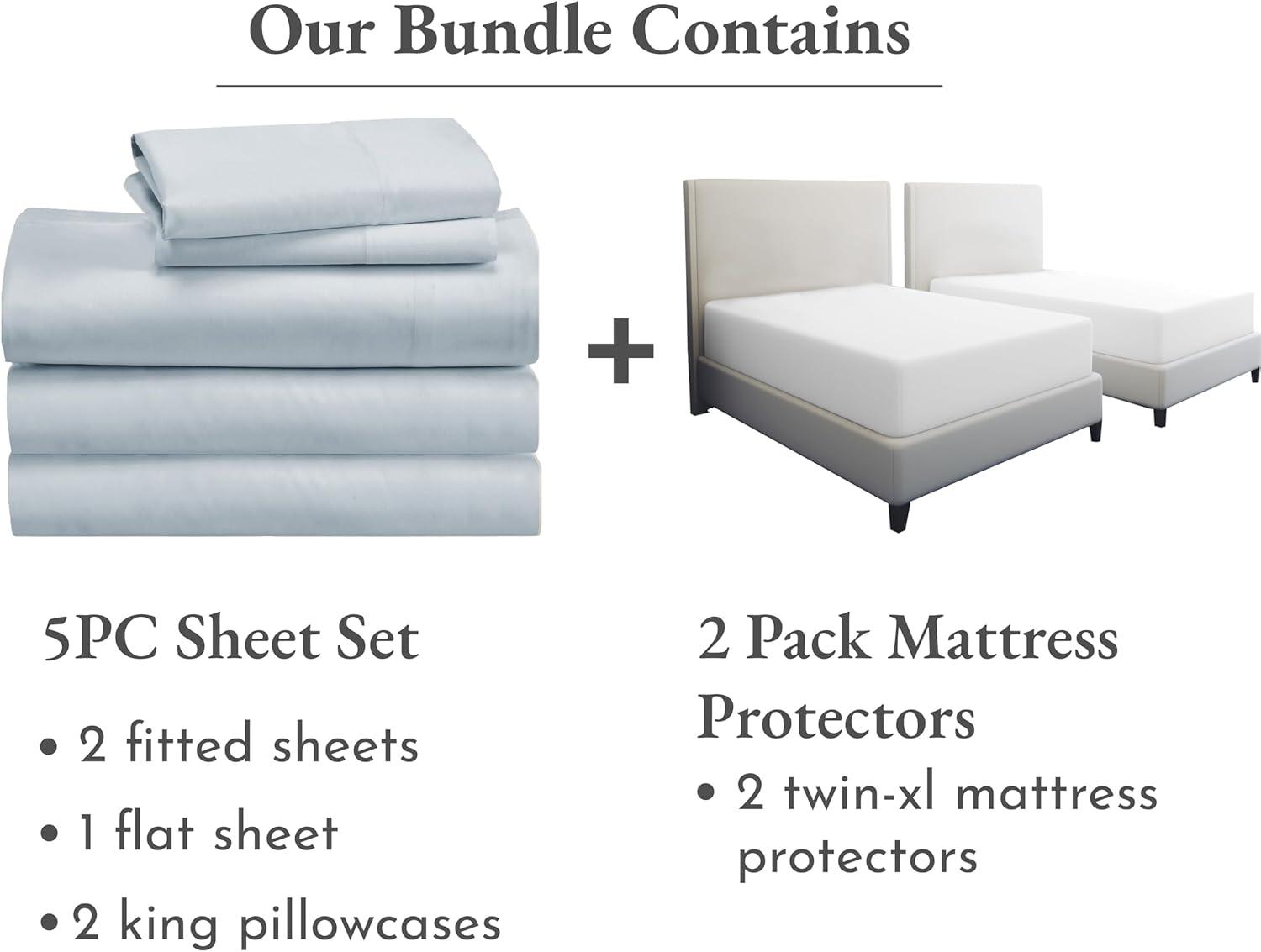 7 Piece Split King Sheet Set Size Sheet Set (Light Blue) and Waterproof Mattress Protector (White) Bundle - 500 Thread Count 100% Cotton Sateen, 5 Piece Sheet Set with 2 Mattress Protectors