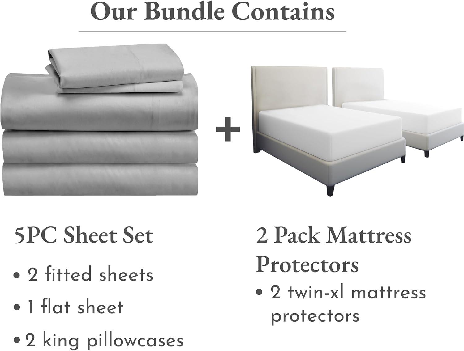 image7 Piece Split King Sheet Set Size Sheet Set Light Grey and Waterproof Mattress Protector White Bundle  500 Thread Count 100 Cotton Sateen 5 Piece Sheet Set with 2 Mattress Protectors