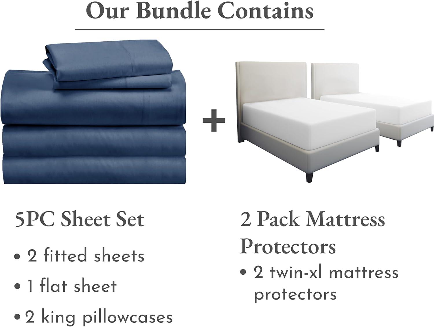 7 Piece Split King Sheet Set Size Sheet Set (Navy Blue) and Waterproof Mattress Protector (White) Bundle - 500 Thread Count 100% Cotton Sateen, 5 Piece Sheet Set with 2 Mattress Protectors
