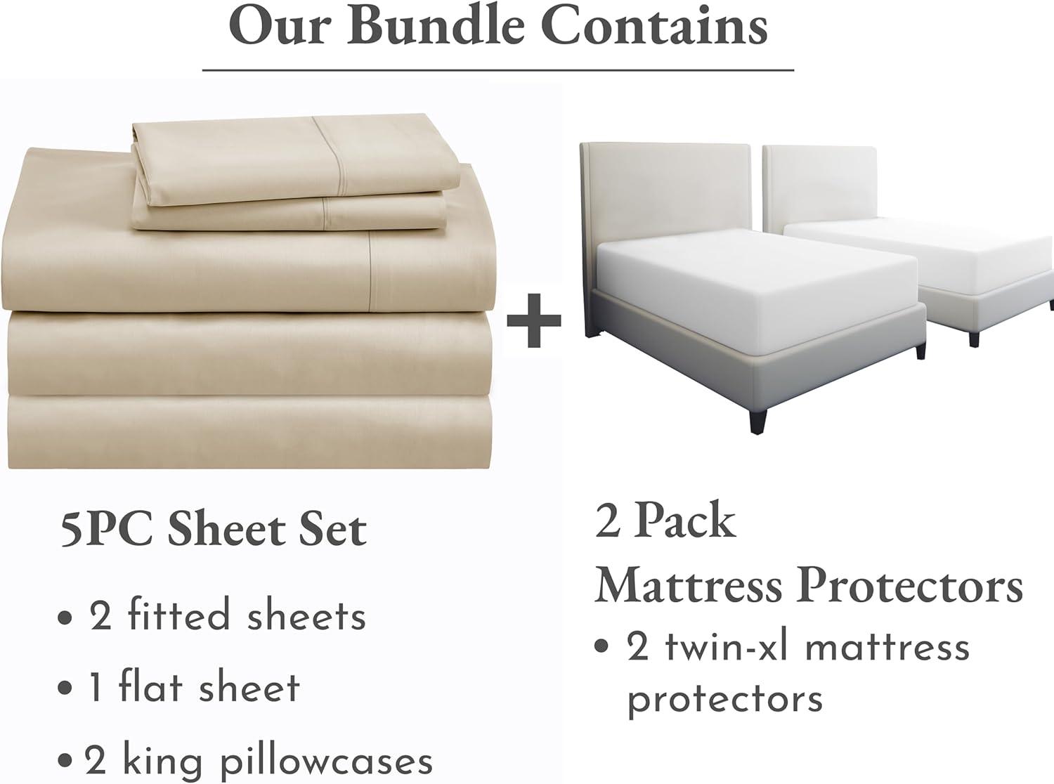 7 Piece Split King Size Sheet Set (Golden Beige) and Waterproof Mattress Protector (White) Bundle - 400 Thread Count 100% Cotton Sateen 5 Piece Sheet Set with 1 Mattress Protector