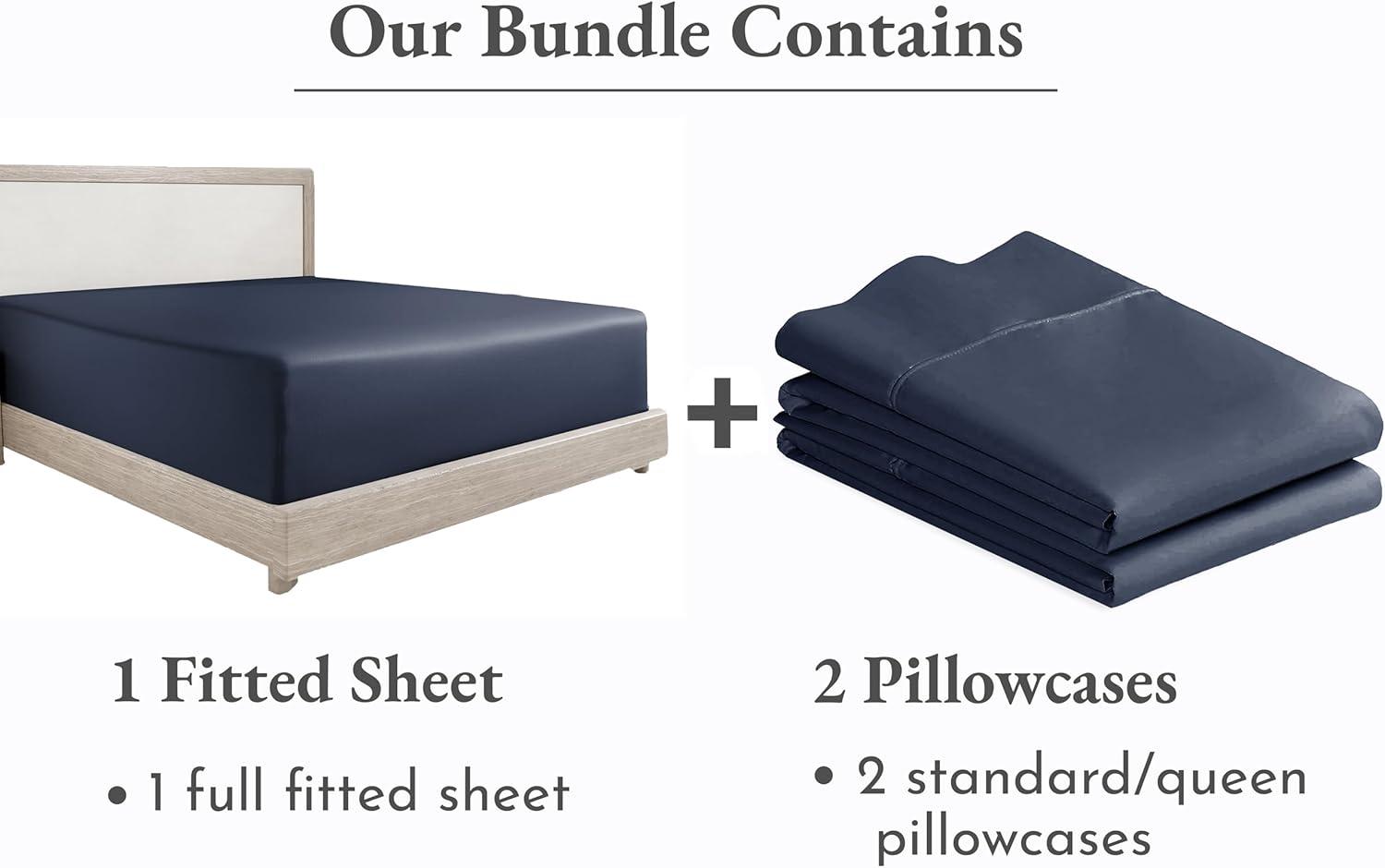 “Experience unmatched comfort and quality with our 400 thread count bedding bundle, featuring a fitted Full sheet and a pair of standard/queen pillowcases. Crafted from 100% long-staple Indian cotton, these products are exceptionally soft, durable, and breathable, ensuring a restful night's sleep. The fitted sheet, with its premium elastic and deep pockets, stays snug on mattresses up to 16″” deep, ensuring it won't slip or bunch up. The pillowcases, designed to fit both standard and queen-size pillows, feature a 4-inch hem to keep your pillows secure. These fitted sheets and pillowcases don't pill, fade, or shrink but become softer with each wash. This bundle promises not just luxury but practicality, with easy machine wash and care. Both items are OEKO-TEX certified, free from harmful substances, and backed by our 30-day return policy. Transform your sleep experience with this high-quality bedding bundle.”
