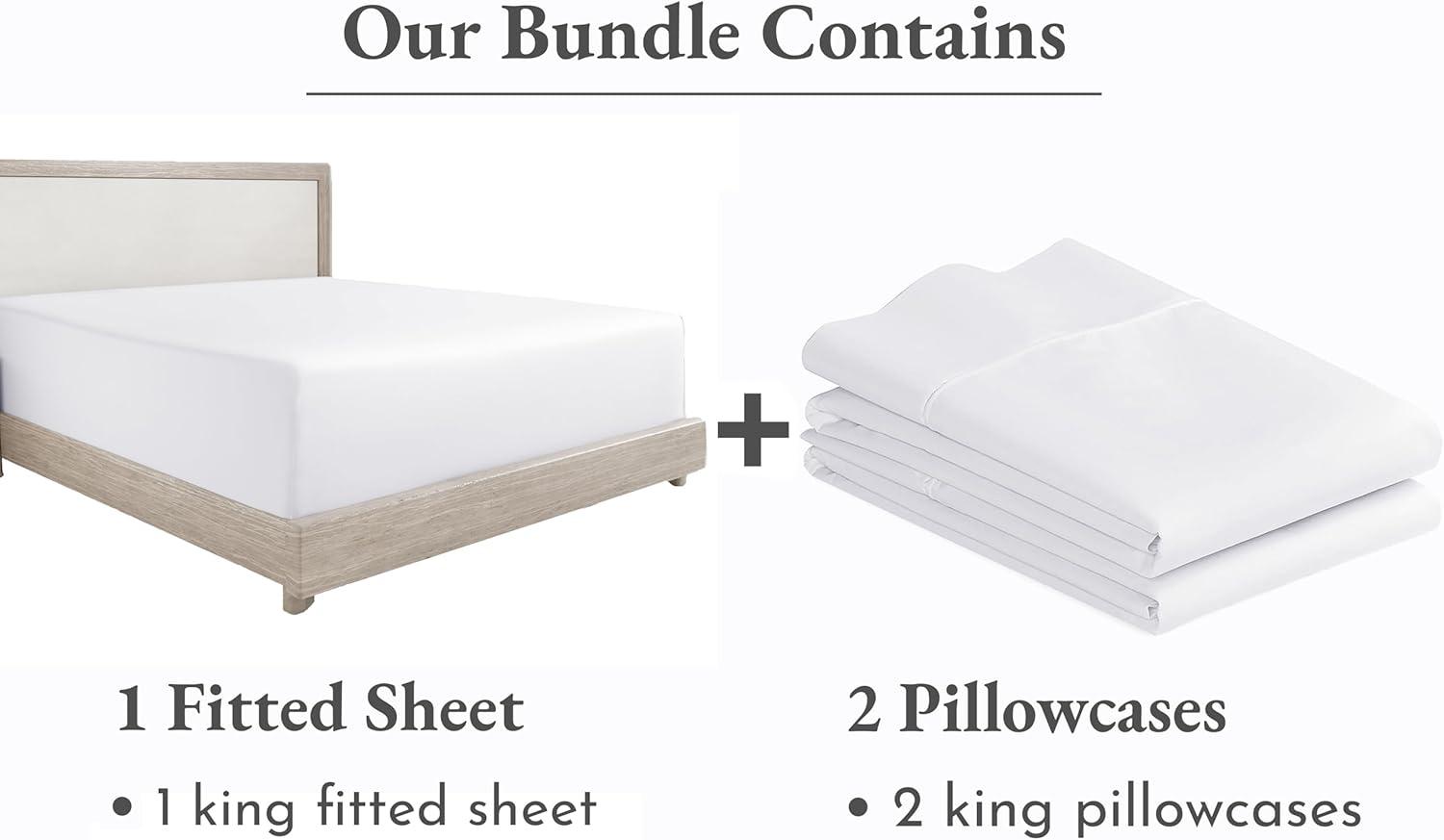 “Experience unmatched comfort and quality with our 400 thread count bedding bundle, featuring a fitted King sheet and a pair of king pillowcases. Crafted from 100% long-staple Indian cotton, these products are exceptionally soft, durable, and breathable, ensuring a restful night's sleep. The fitted sheet, with its premium elastic and deep pockets, stays snug on mattresses up to 16″” deep, ensuring it won't slip or bunch up. The pillowcases, designed to fit king-size pillows, feature a 4-inch hem to keep your pillows secure. These fitted sheets and pillowcases don't pill, fade, or shrink but become softer with each wash. This bundle promises not just luxury but practicality, with easy machine wash and care. Both items are OEKO-TEX certified, free from harmful substances, and backed by our 30-day return policy. Transform your sleep experience with this high-quality bedding bundle.”