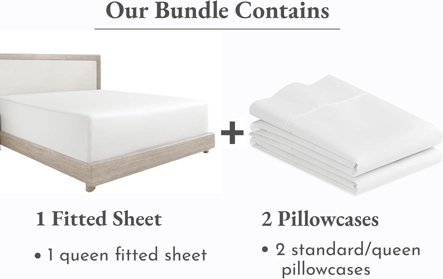 “Experience unmatched comfort and quality with our 400 thread count bedding bundle, featuring a fitted Queen sheet and a pair of standard/queen pillowcases. Crafted from 100% long-staple Indian cotton, these products are exceptionally soft, durable, and breathable, ensuring a restful night's sleep. The fitted sheet, with its premium elastic and deep pockets, stays snug on mattresses up to 16″” deep, ensuring it won't slip or bunch up. The pillowcases, designed to fit both standard and queen-size pillows, feature a 4-inch hem to keep your pillows secure. These fitted sheets and pillowcases don't pill, fade, or shrink but become softer with each wash. This bundle promises not just luxury but practicality, with easy machine wash and care. Both items are OEKO-TEX certified, free from harmful substances, and backed by our 30-day return policy. Transform your sleep experience with this high-quality bedding bundle.”