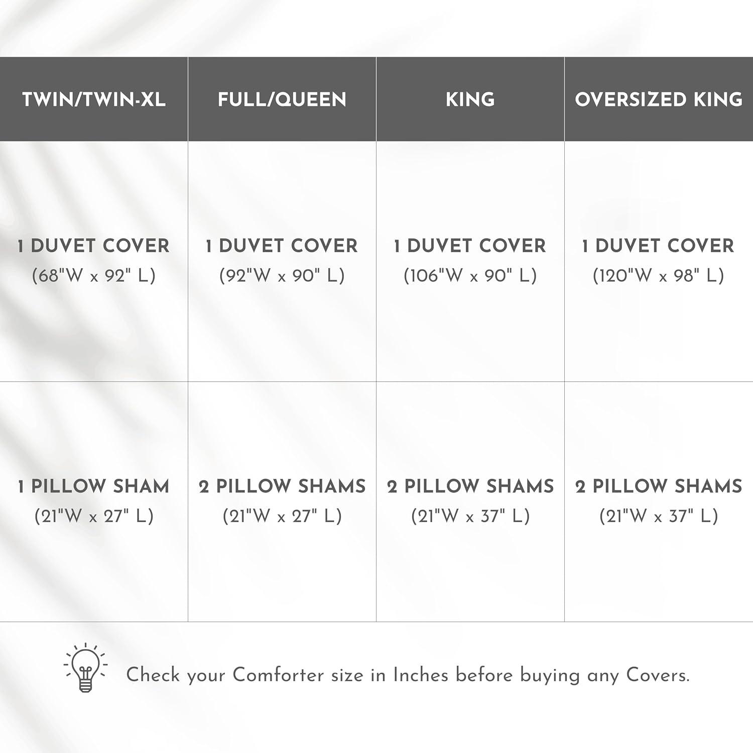 MEASURE BEFORE YOU BUY PLEASE: Our 3 Piece king size duvet cover set contains 1 duvet cover (106'' Wx90'' L) & 2 pillow shams ( fits king 21'' Wx37'' L pillows) with high-quality stitching for long-lasting durability. Please measure your comforter size to evaluate if our duvet cover is a match.