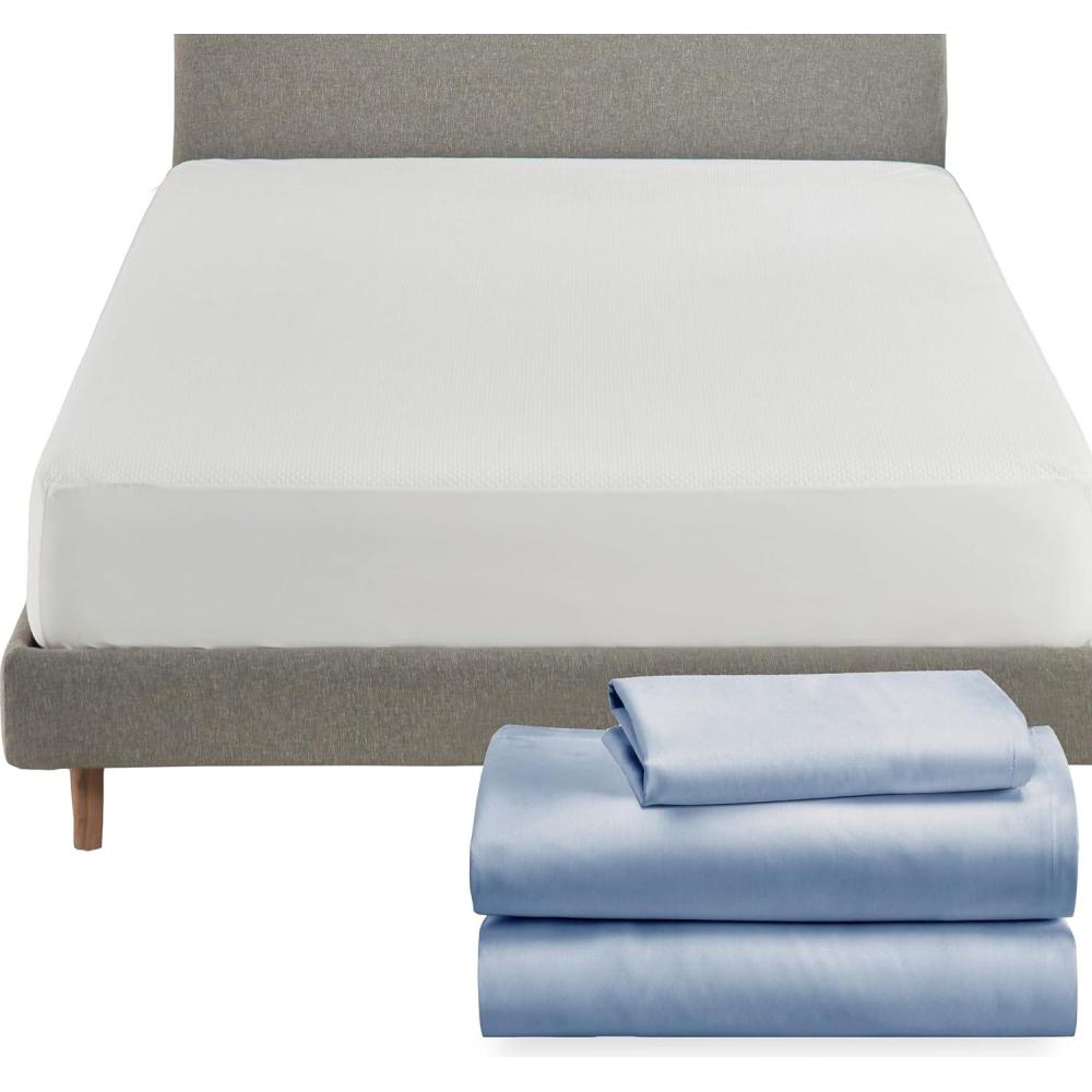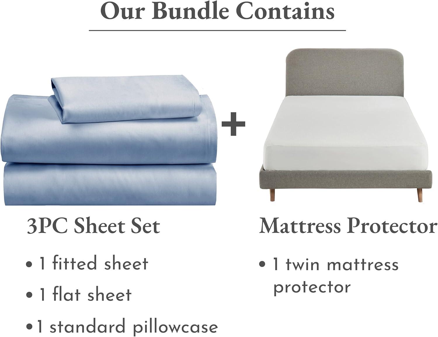 Enhance your bedroom with our 100% Cotton Twin Sheet Set paired with a robust Twin Mattress Protector. This premium bundle combines luxurious comfort with practical protection, making it an ideal choice for anyone looking to upgrade their bedding experience. Our 3 piece sheet set includes 1 flat sheet, 1 fitted sheet with a 12″ deep pocket, and 1 standard-sized pillowcase, all made from naturally soft and breathable 100% cotton sateen. This material ensures a cool and comfortable sleep through all seasons, celebrated for its quality, softness, and longevity. These sheets are oved for their ability to get softer with each wash. They feature an all-round elastic and “head side / foot side” indicators for effortless bed-making. Complement your comfortable sheets with our waterproof Twin Mattress Protector that shields your mattress from spills and stains without compromising on comfort. It is soft, noiseless, breathable, and cooling, ensuring that your sleep is undisturbed and refreshing. Designed to fit like a fitted sheet, it snugly covers mattresses from 8 to 20 inches deep, providing reliable protection without slipping or bunching. Ideal for families, health-conscious individuals, or anyone seeking to maintain a pristine sleeping environment, this bundle offers a seamless blend of luxury and functionality. Certified STANDARD 100 by OEKO-TEX, our products ensure safety from harmful substances and are packaged using non-plastic materials in support of our commitment to ethical processes. This bedding set not only promises exceptional comfort but also supports local charities, making it a thoughtful purchase for mindful consumers.