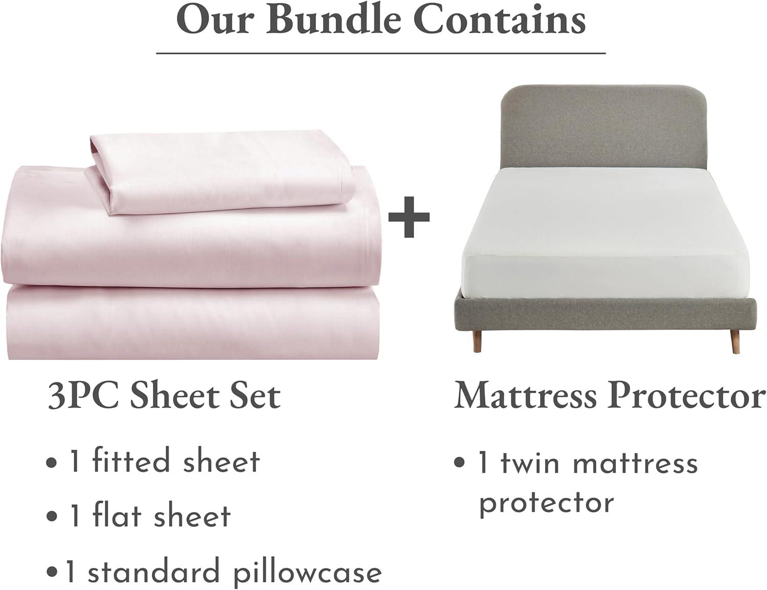 California Design Den 4 Piece Twin Size Sheet Set (Pink) and Waterproof Mattress Protector (White) Bundle – Soft 100% Cotton Sateen 3 Piece Sheet Set with 1 Mattress Protector