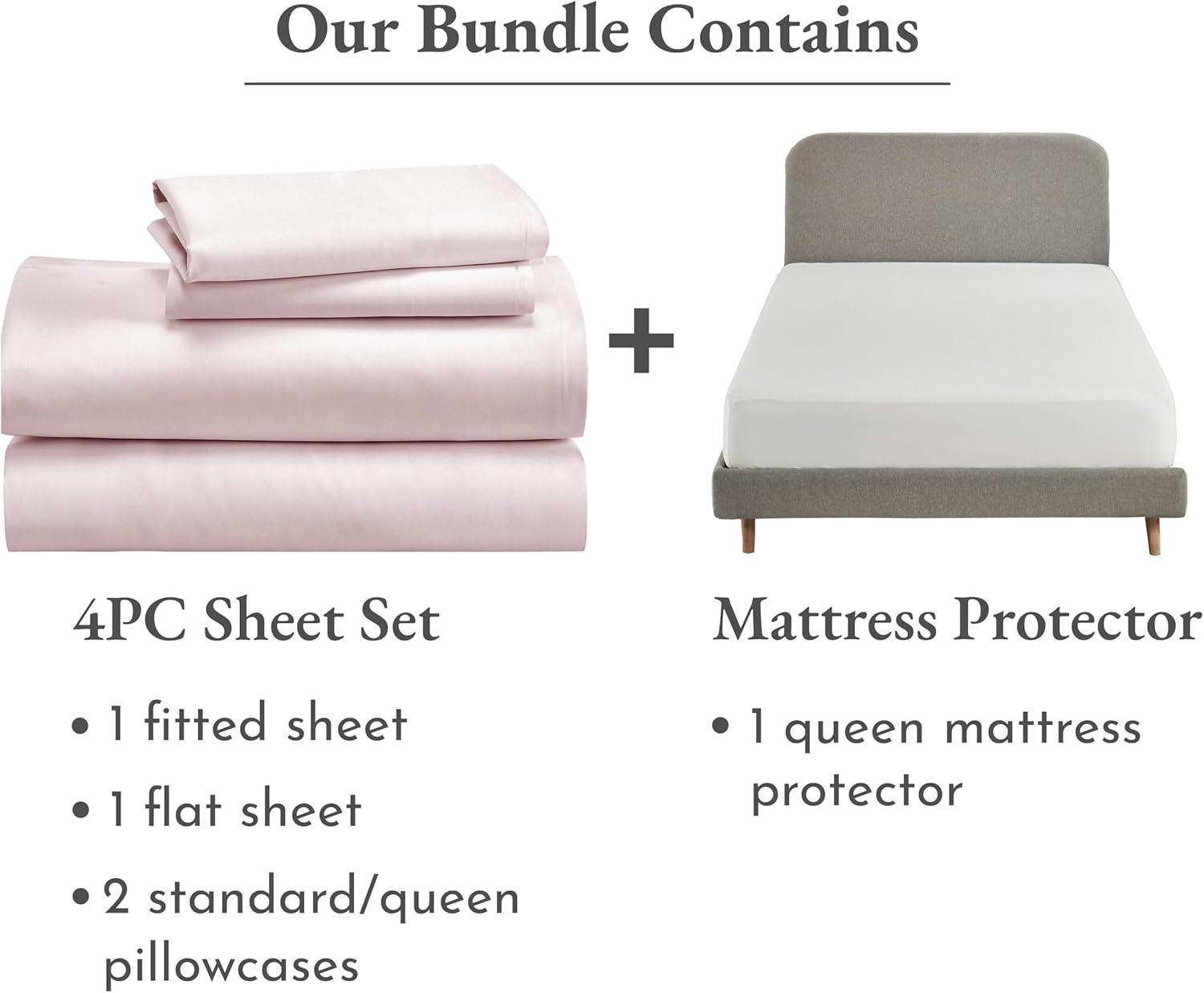 California Design Den 5 Piece Queen Size Sheet Set (Pink) and Waterproof Mattress Protector (White) Bundle – Soft 100% Cotton Sateen 4 Piece Sheet Set with 1 Mattress Protector
