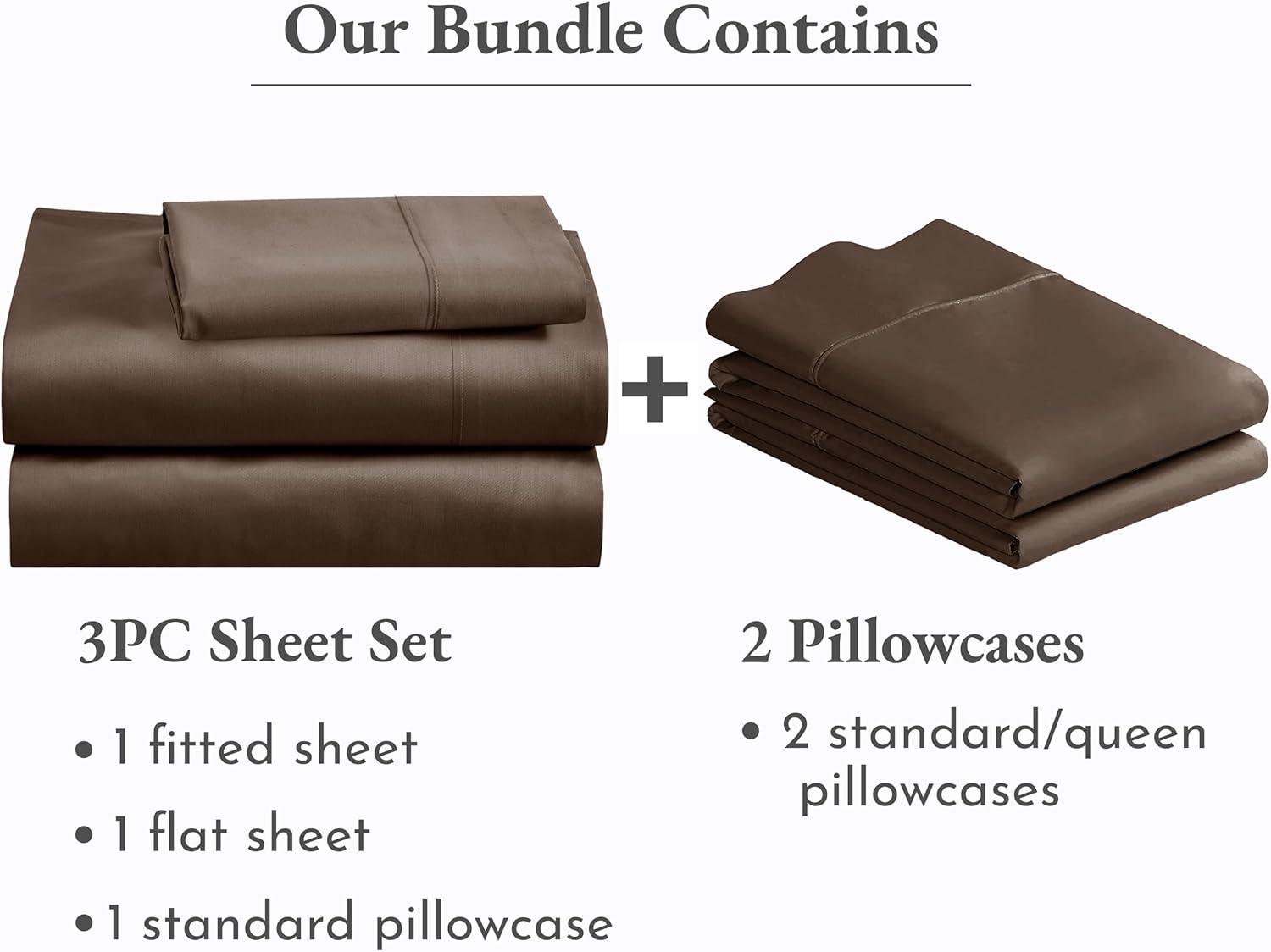 What's included in this 5 Piece Twin Size Sheet Set: 1 flat sheet (66″W x 100″L), 1 bottom fitted sheet (39″W x 75″L) with all around elastic (fits 8″ to 15″ mattresses), 1 standard size pillowcase (21″W x 30″L) to fit standard size pillow and 2 standard / queen size pillowcases (21″W x 32″L) to fit both standard and queen size pillows.