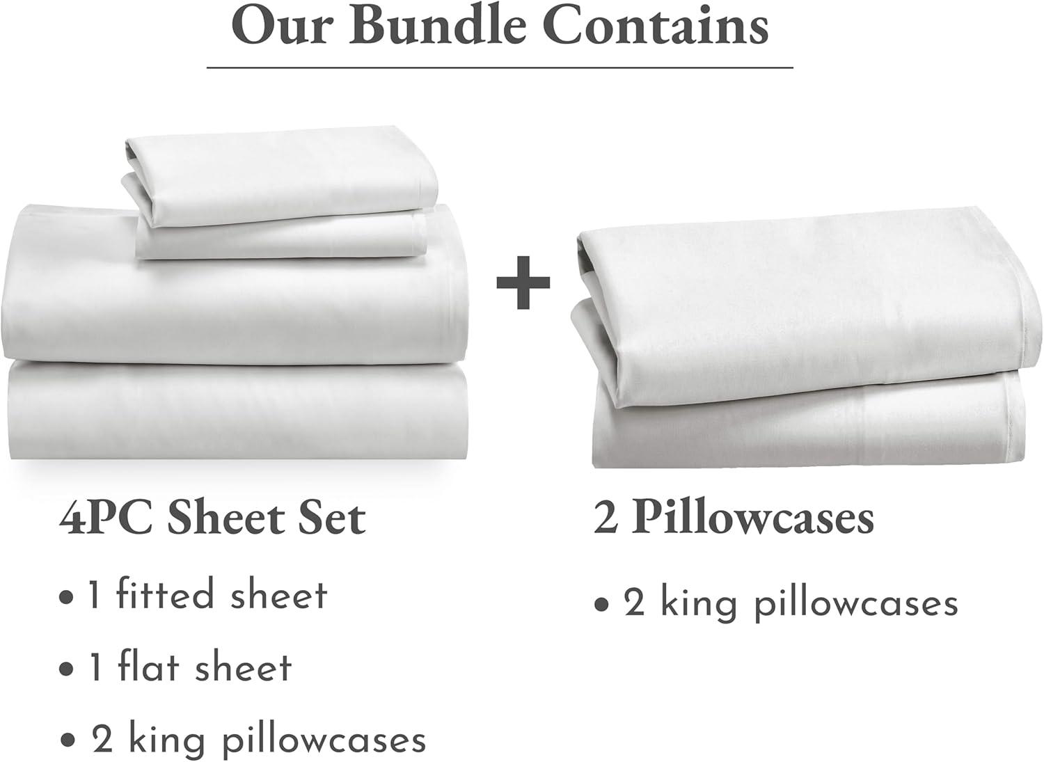 What's Included in This 6 Piece King Size Bedding Bundle: 1 flat sheet (112″W x 102″L), 1 bottom fitted sheet (78″W X 80″L) with all around elastic (fits 8″ to 14″ mattresses) and 4 king size pillowcases (21″W x 36″L) to fit king size pillows.