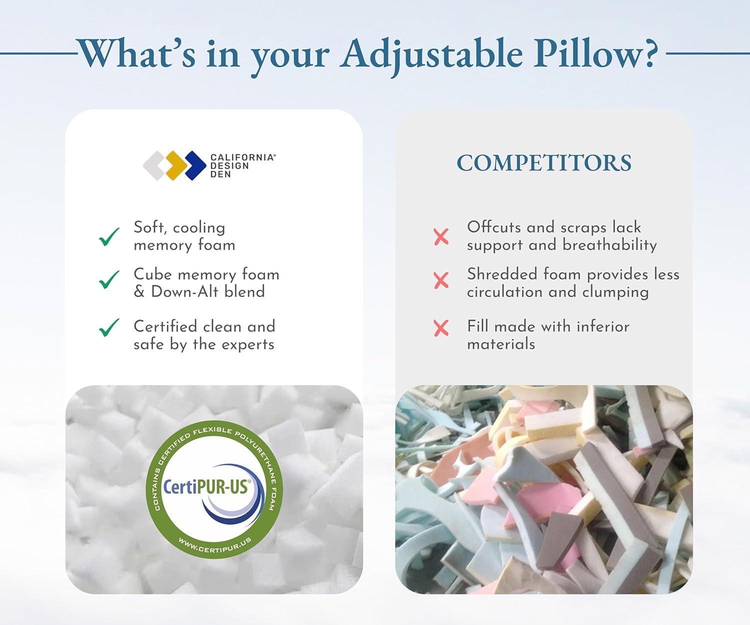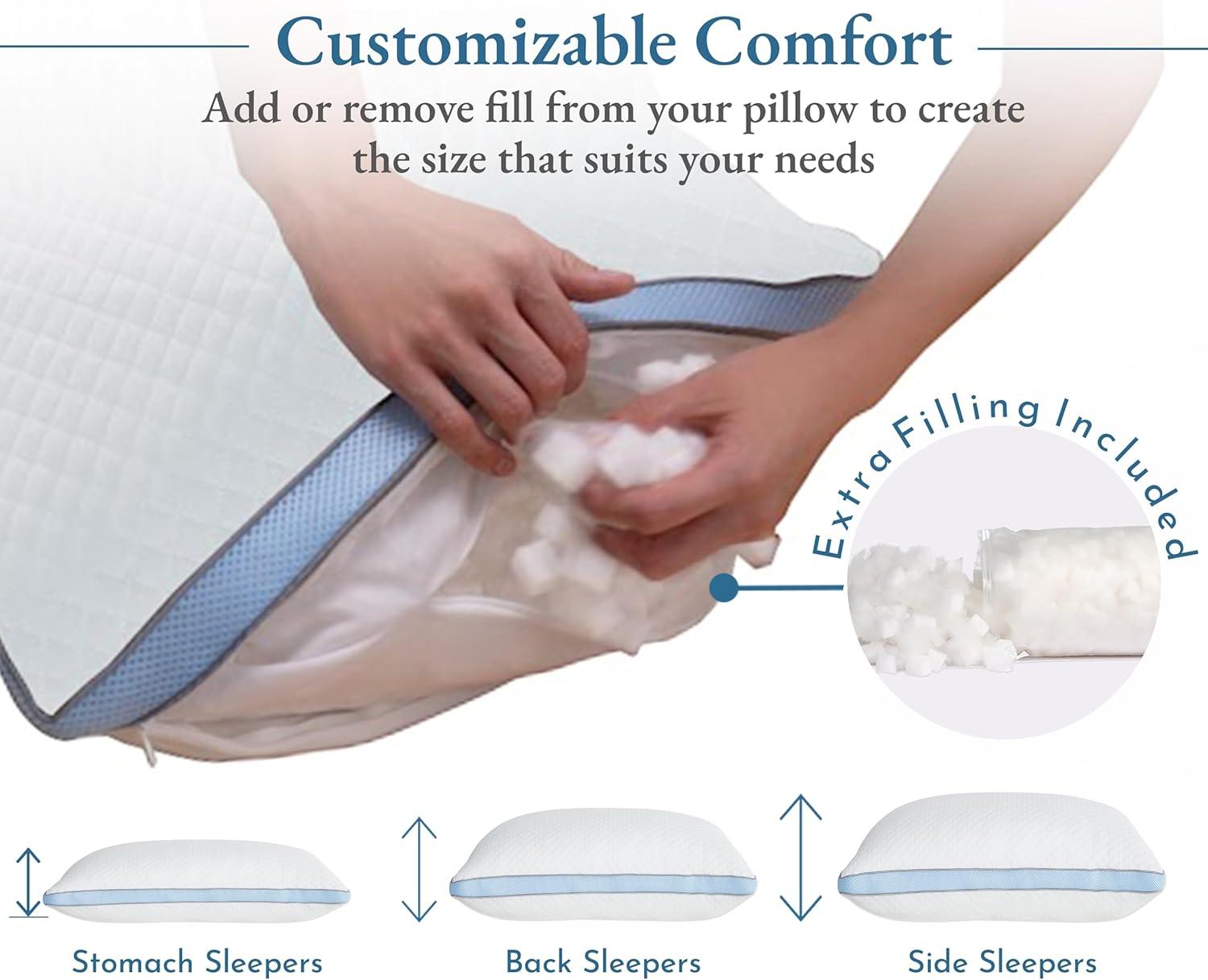 Adjustable Loft & Feel: Customize your comfortable sleep with our 1 piece adjustable queen size pillow / standard bed pillow (18″ W x 28″ L) suitable for any mattress size or type. The zippered inner core of memory foam pieces allows easy customization for your preferred height and firmness. Just use the extra fill that comes with the product. No foam scraps here but only engineered cubes for total comfort.