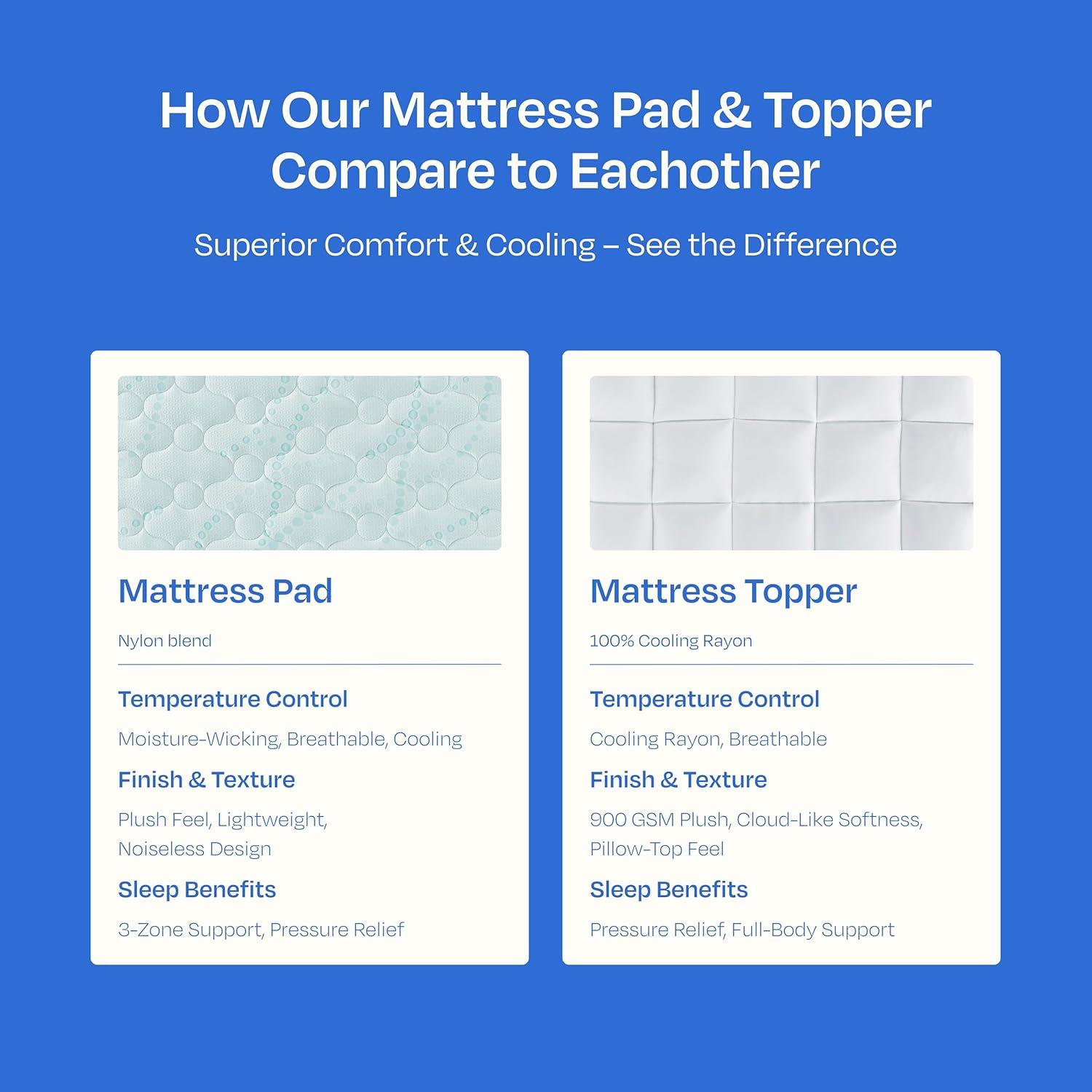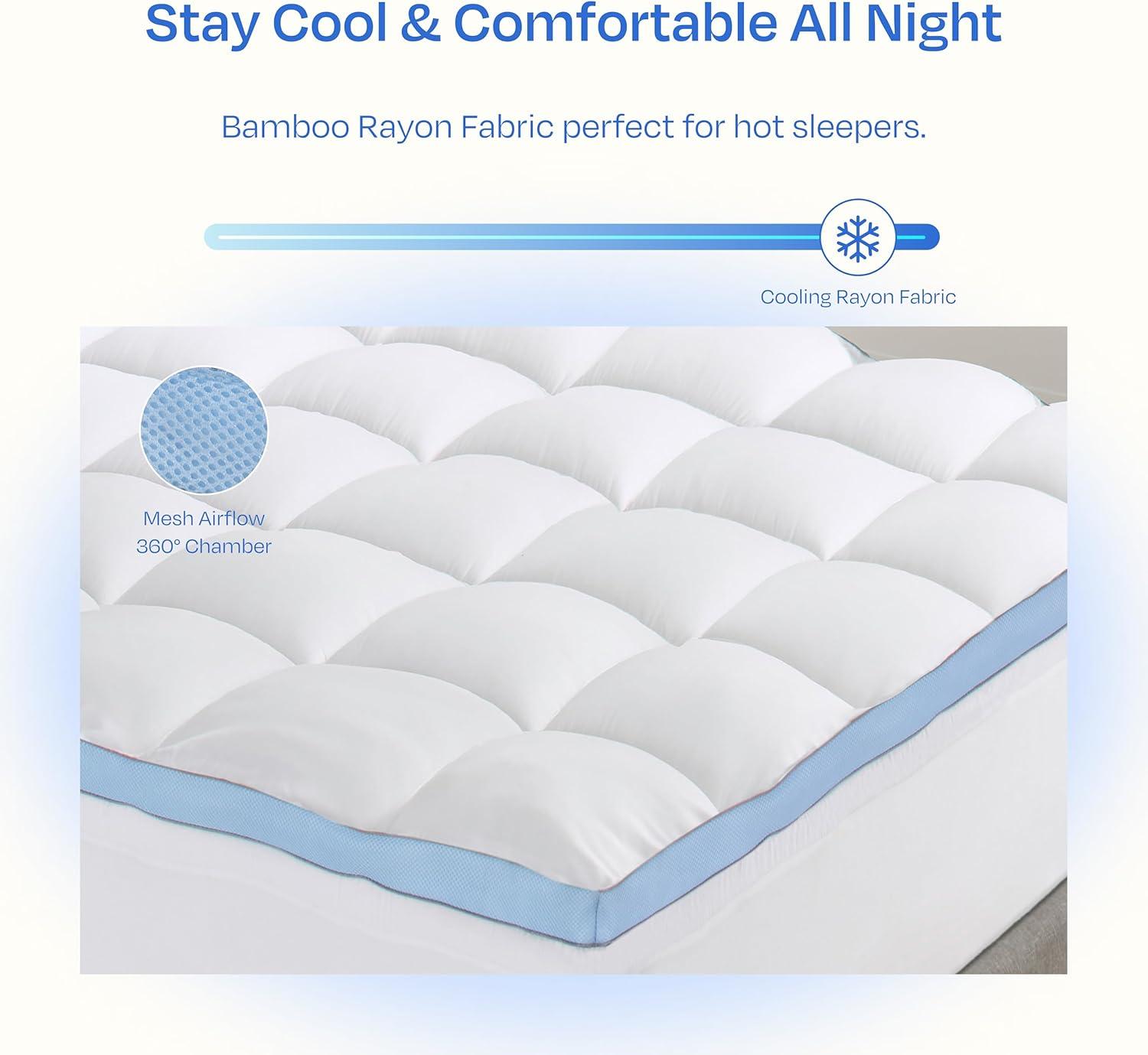 Stay Cool All Night: Say goodbye to hot, restless nights. Our cooling california king topper features 100% cooling rayon fabric, known for its breathability and moisture wicking properties. The silky soft material of this mattress topper california king size ensures you stay cool and dry, making it perfect for hot sleepers and those with foam mattresses.