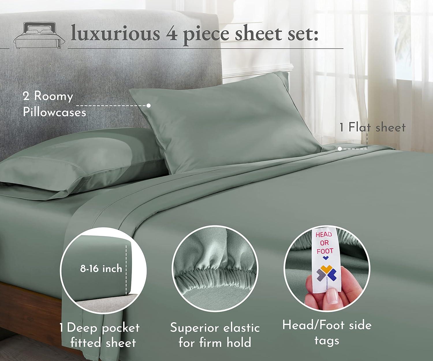 California Design Den Full Size Black Sheet Set - 6 Piece Set Ultra Soft 100% Cotton Sheets, 400 Thread Count Luxury Sateen Weave, Deep Pocket Bedsheets, Includes 4 Pillowcases (Full, True Black)(Sage Green)