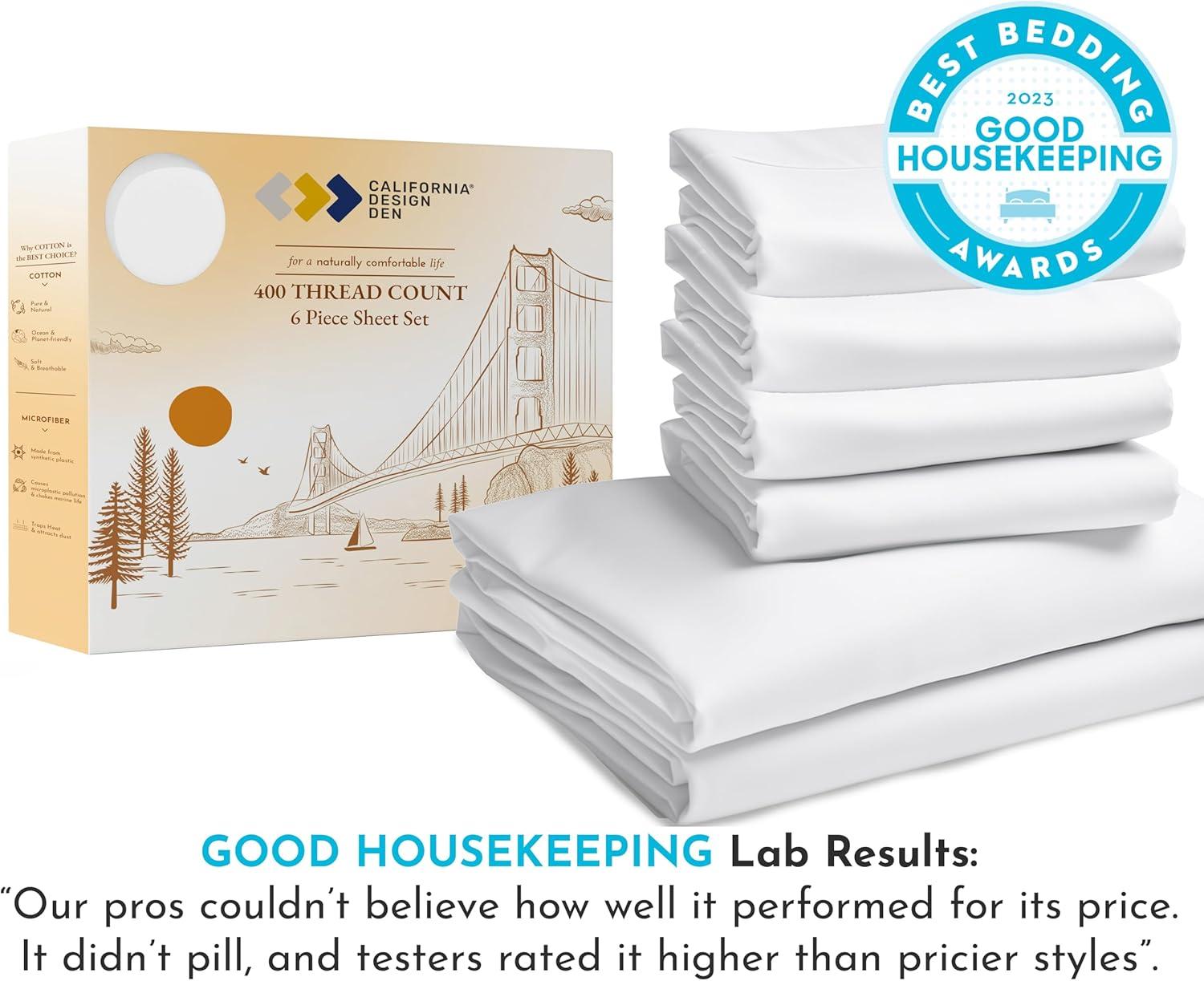 Transform your sleep experience with our Good Housekeeping Award Winner 400 Thread Count Sheet Set. Crafted from 100% long-staple cotton, these sheets offer the perfect blend of softness, strength, and breathability, ensuring a restful and rejuvenating night's sleep. These sheets are designed to provide exceptional durability and softness. The sateen weave enhances the fabric's natural sheen and smooth texture. With a 400 thread count, these sheets strike the perfect balance between luxury and comfort, offering a silky-smooth feel against your skin. The fitted sheet features deep pockets that easily accommodate mattresses up to 16 inches deep, ensuring a snug and secure fit. The all around premium elastic keeps the sheet in place all night long. The natural cotton fibers are breathable, promoting airflow and helping to regulate body temperature for a comfortable sleep. Our sheets are designed to keep you cool in the summer and warm in the winter, making them perfect for year-round use. The breathable cotton fabric ensures maximum comfort in any climate. Available in a variety of colors and patterns, our sheet set adds a touch of elegance to any bedroom decor.
