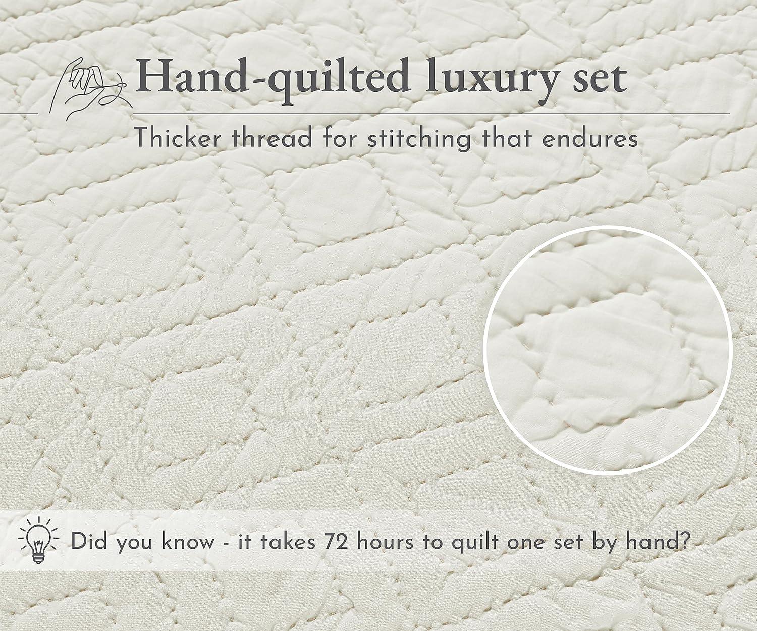 Hand Quilted & Pre Washed Quilt Set; 100% Cotton Fabric with Soft & Fluffy Poly fill: Includes 1 Quilt & 2 Quilted Pillow Shams. Stay cozy beneath this beautiful, handmade quilt. Our beautiful bedspreads provide the perfect blanket quilt for any season or room. This hand-quilted full size / queen size set is made with pure cotton fabric and pre-softened with a wash so you can use it straight out of its reusable tote bag. The gorgeous double diamond quilt patterns will elevate your room and works with any style of bedsheet.