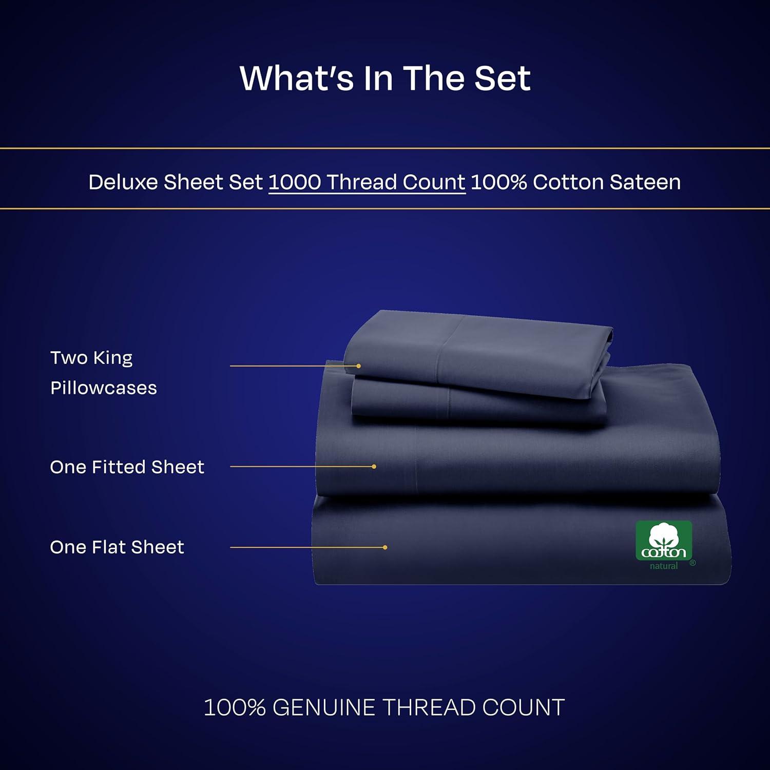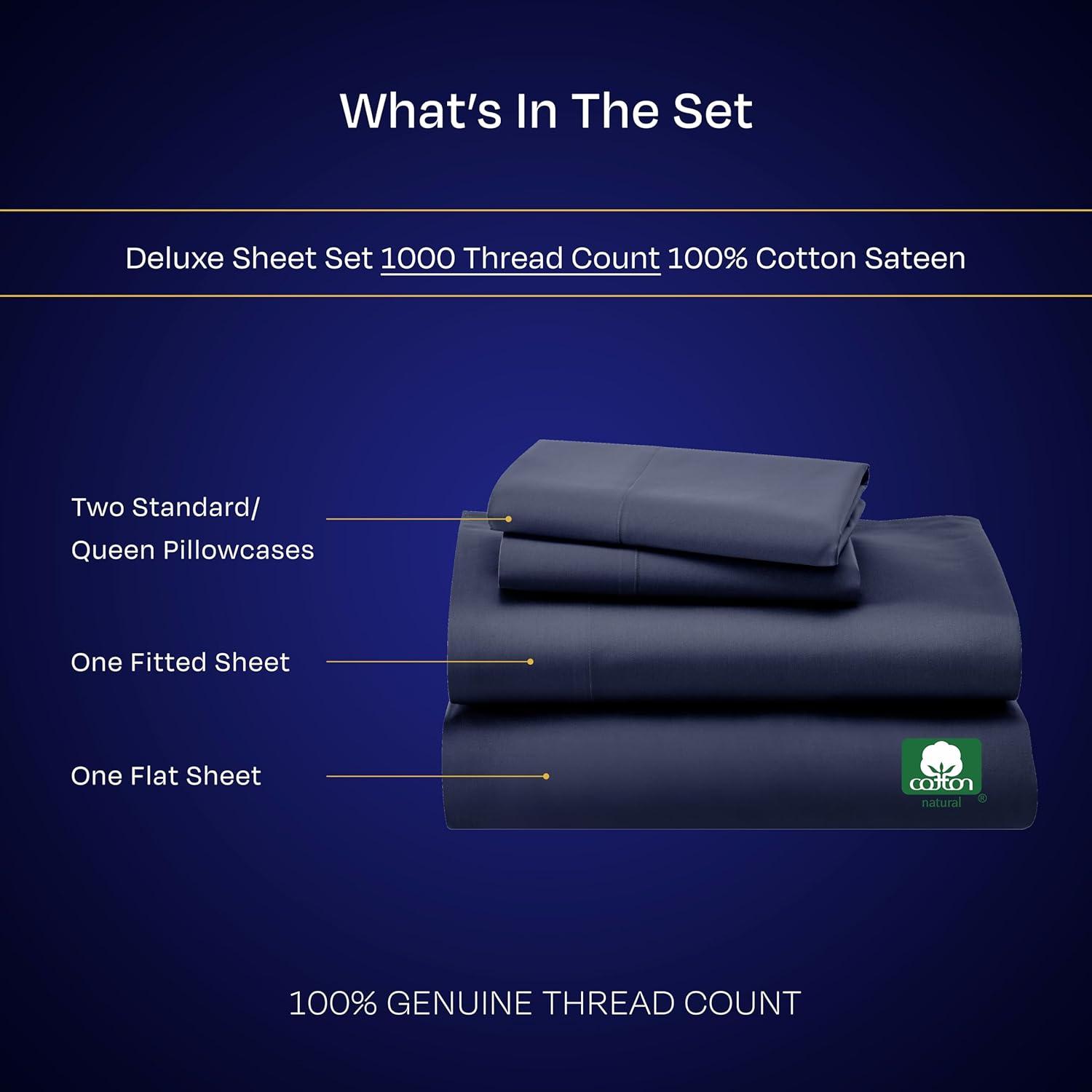 California Design Den Queen Sheet Set - Luxury 1000 Thread Count Sateen, Thick and Natural 100% Cotton Bedsheets, Deep Pockets, Soft, Breathable and Durable Bedding Set - White(Navy Blue)