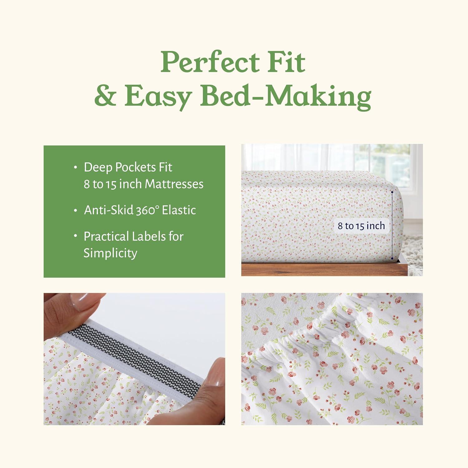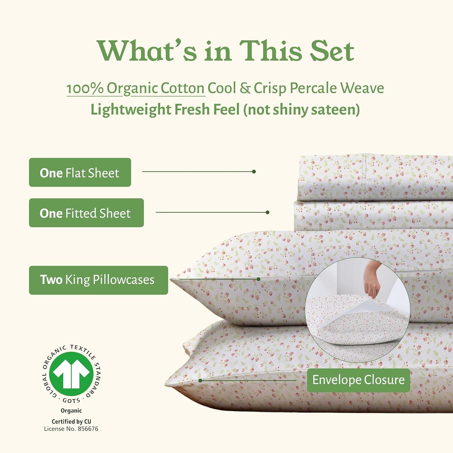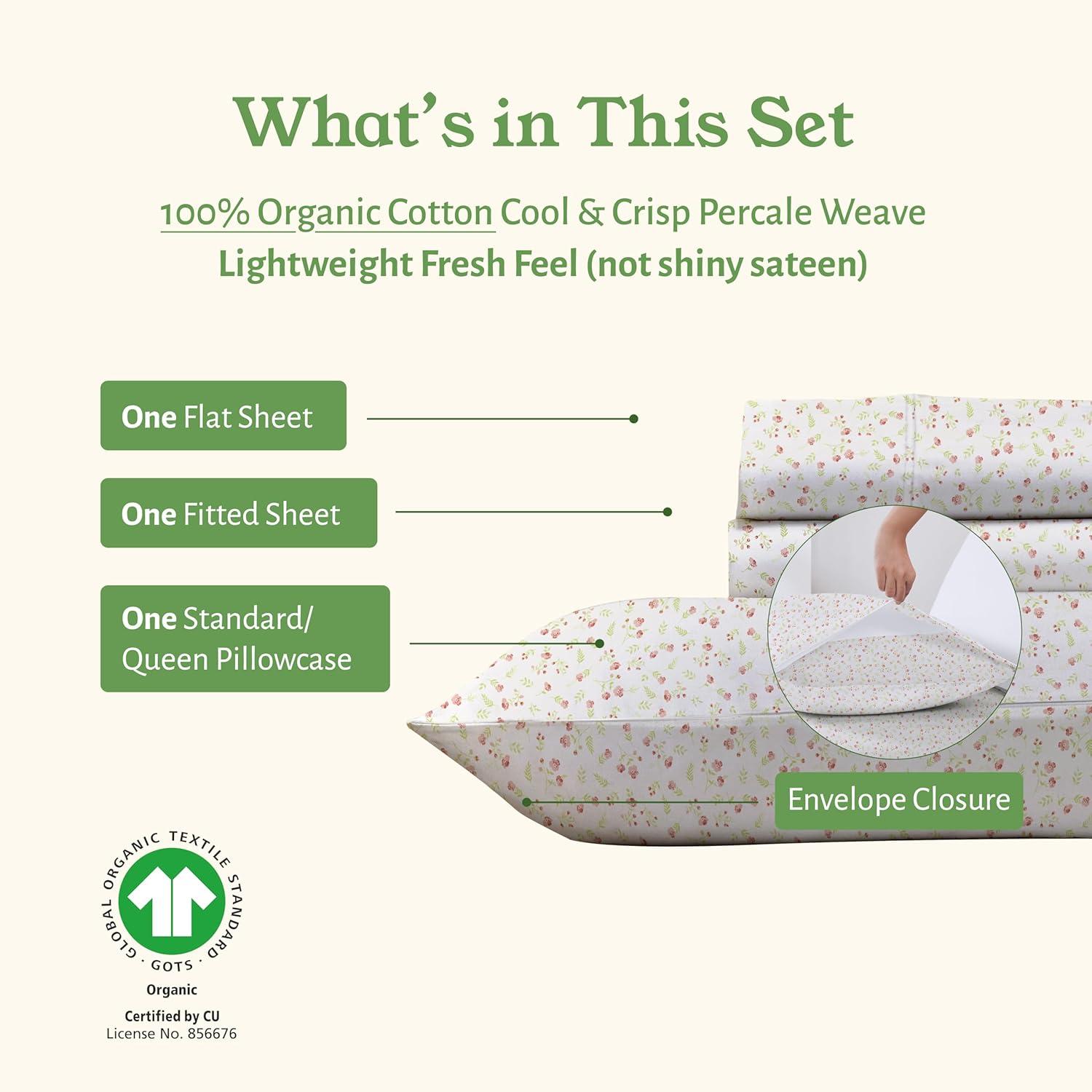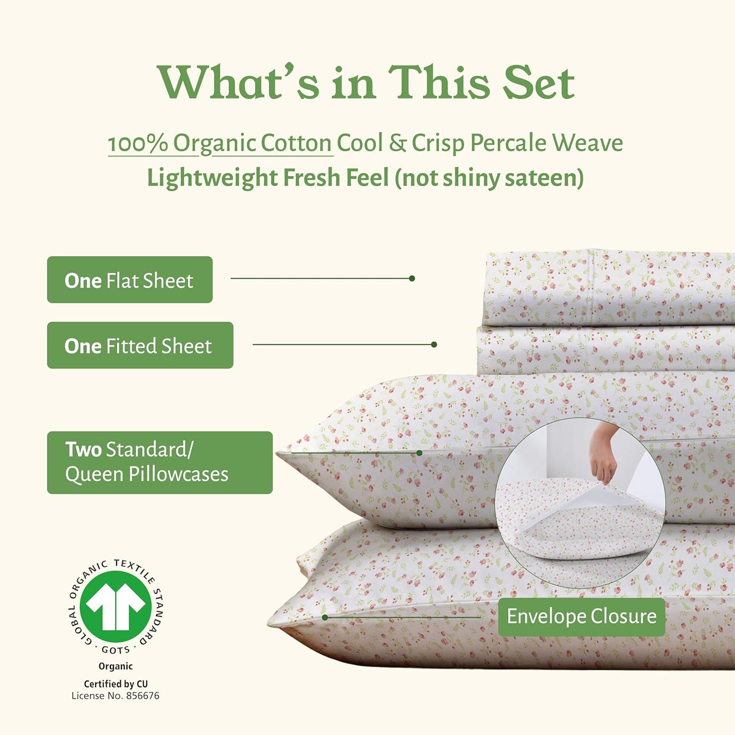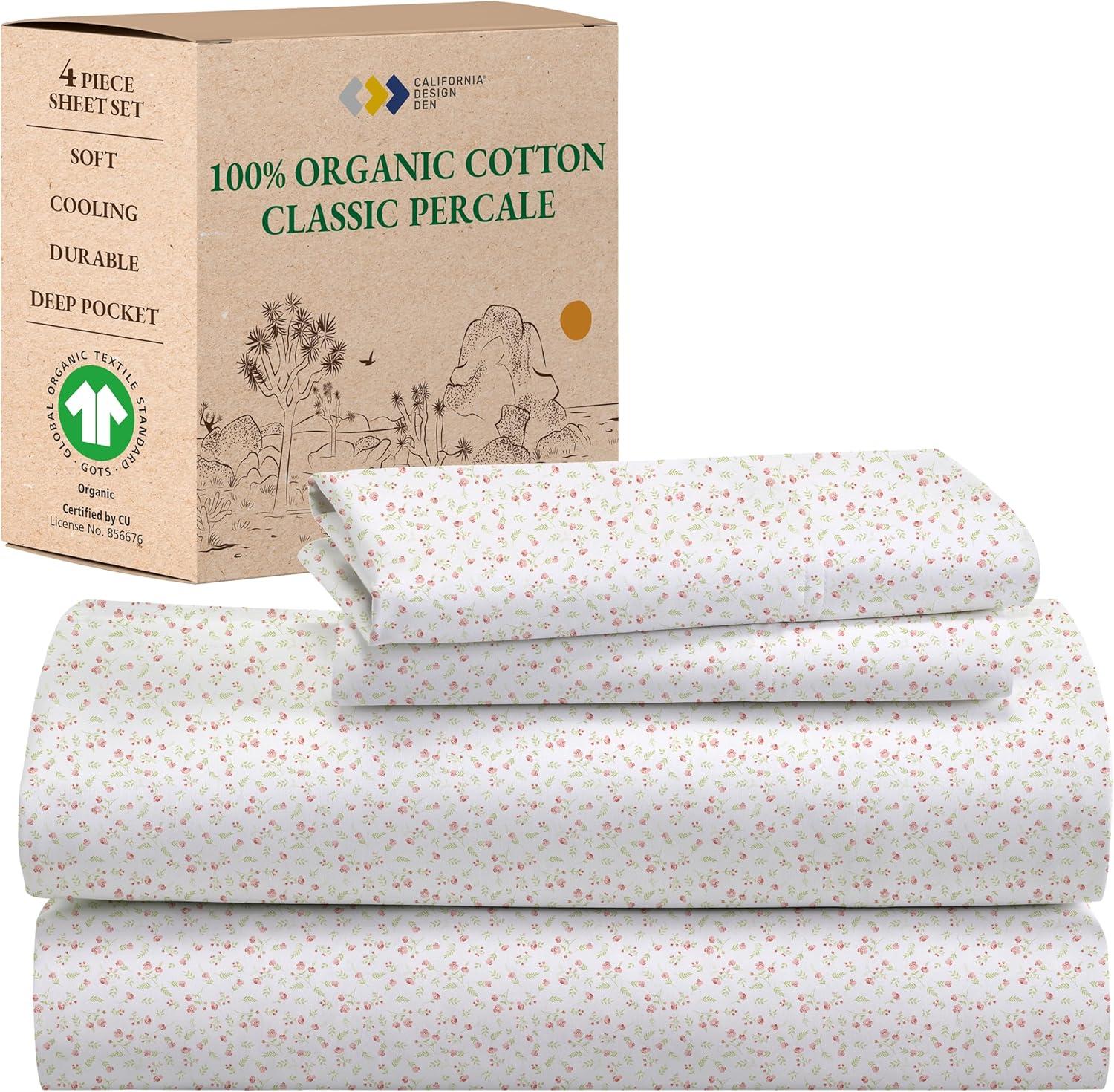 California Design Den Queen Sheet Set – Soft 100% Organic Cotton Sheets with Deep Pockets, Crisp Percale, Breathable and Durable Bedding Set – White(16 – Floral Print)