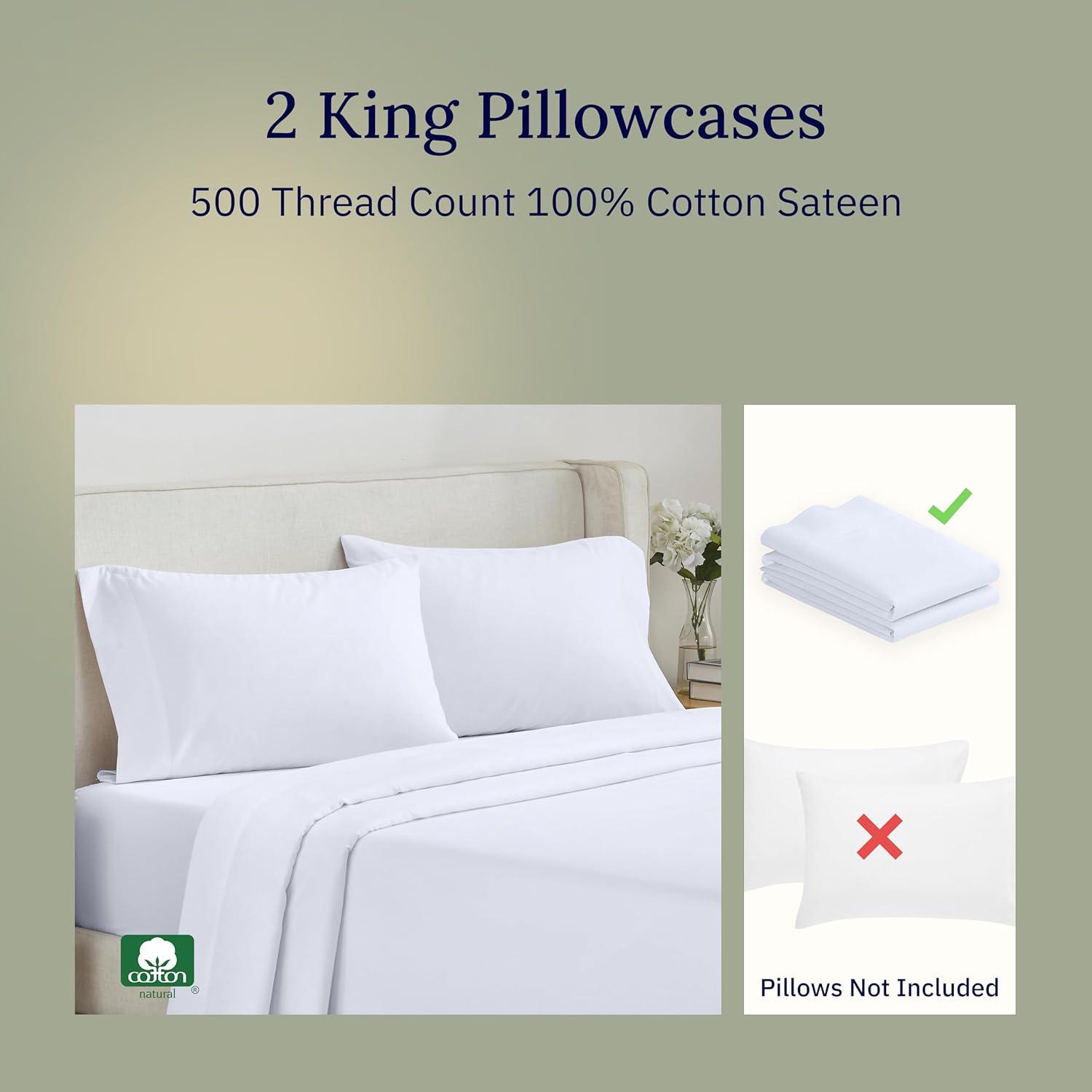 Softest 100% Cotton Pillowcases – Savor your sleep with our set of two 500 thread count Cotton Pillowcase Set (21″ W x 32″ L). Made from 100% extra long-staple cotton & a royal sateen weave, these pillow cases are soft as silk, cool, and pure white.
