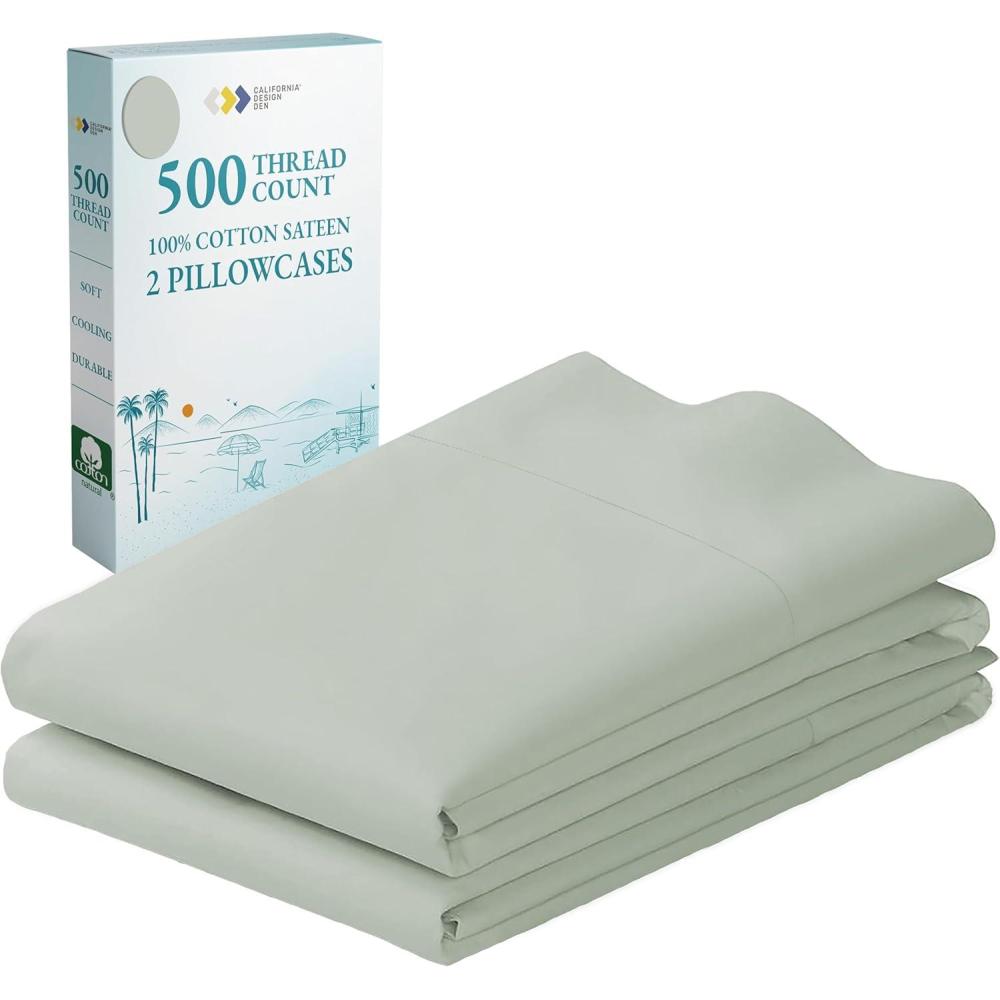 CALIFORNIA DESIGN DEN Soft & Silky 500 Thread Count 100% Cotton is Cool & Smooth, White Pillowcases Queen Size Fits Standard & Queen Pillows (Pure White)(14 – Silver Sage)