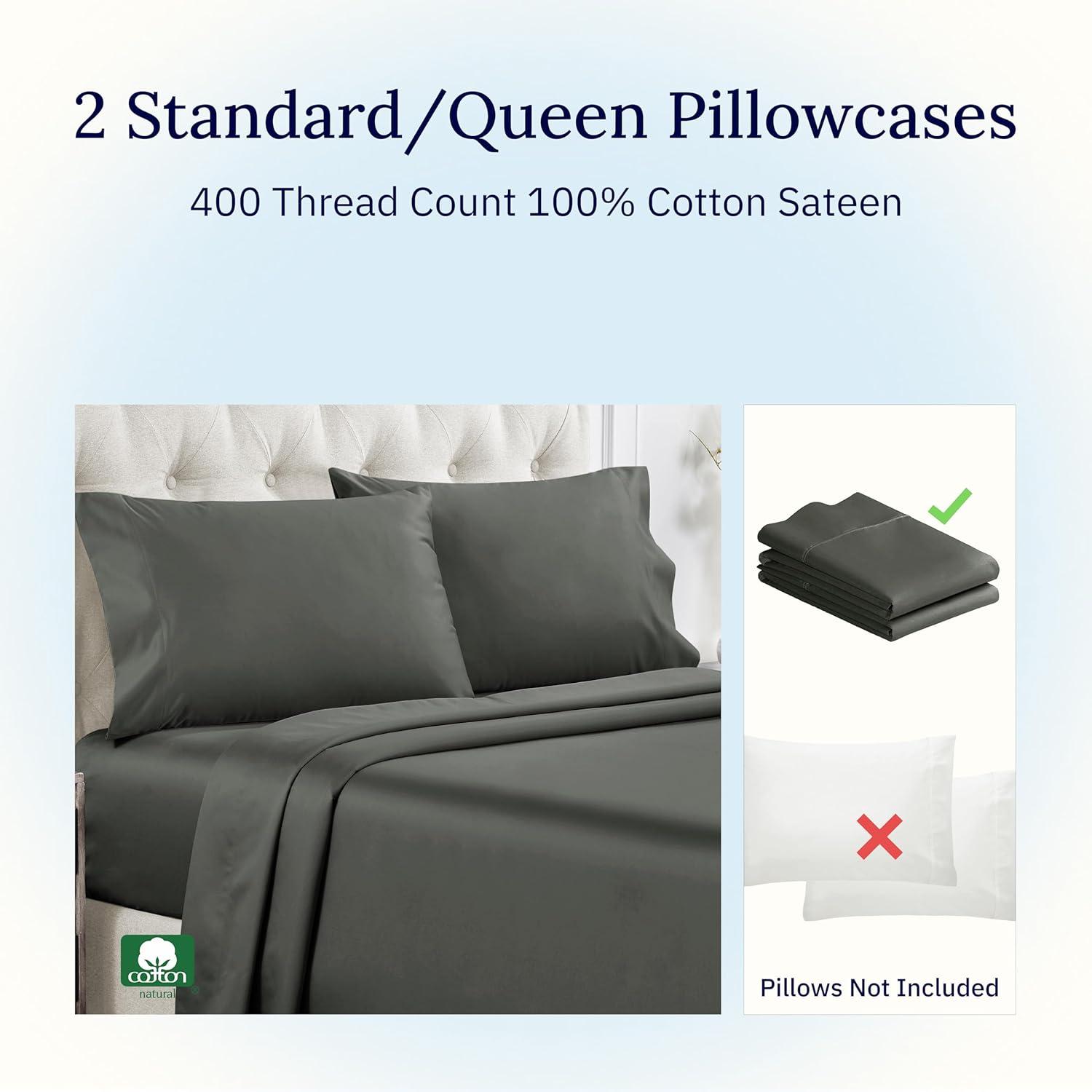 Set of 2 Pillowcases (Pillows Not Included) – Our luxury 400 thread count 100% cotton sateen white queen pillowcase pair is perfect for a restful night's sleep. Made with cooling and breathable cotton, providing comfort for all seasons and for any bedding set. It is designed to fit both standard and queen size pillows.