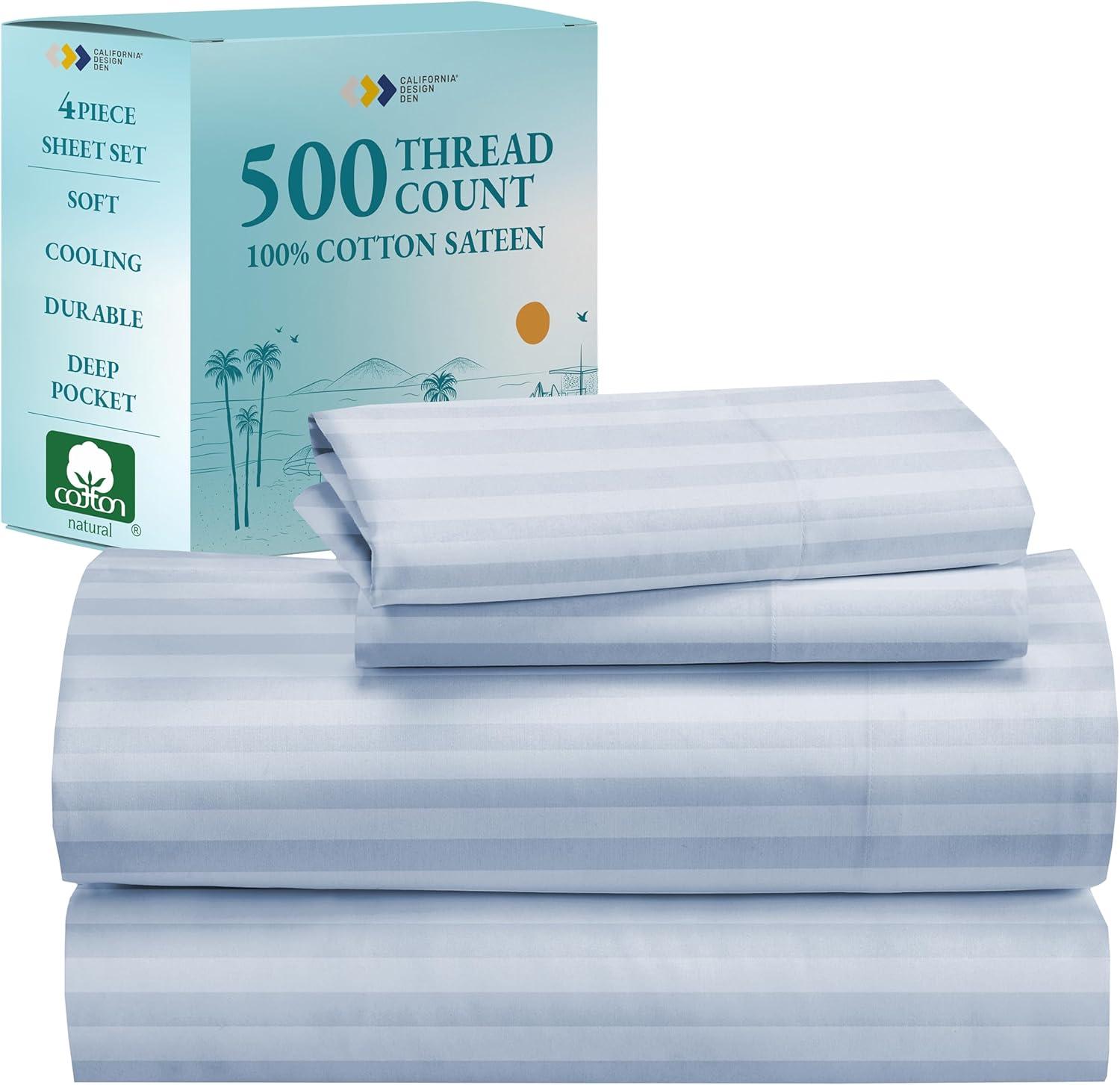 California Design Den – Twin XL Sheet Set Soft 100% Cotton Cooling Sheets Deep Pockets, 500 Thread Count Sateen, Hotel Quality, Damask Stripe Bedding for Home Twin XL Sheets (Light Grey – Striped)(10 – Light Blue Striped)