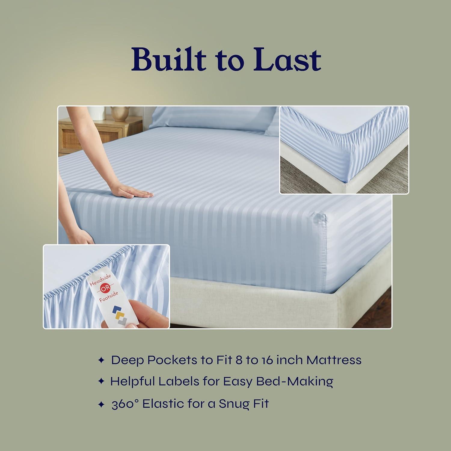 California Design Den - Twin XL Sheet Set Soft 100% Cotton Cooling Sheets Deep Pockets, 500 Thread Count Sateen, Hotel Quality, Damask Stripe Bedding for Home Twin XL Sheets (Light Grey - Striped)(10 - Light Blue Striped)
