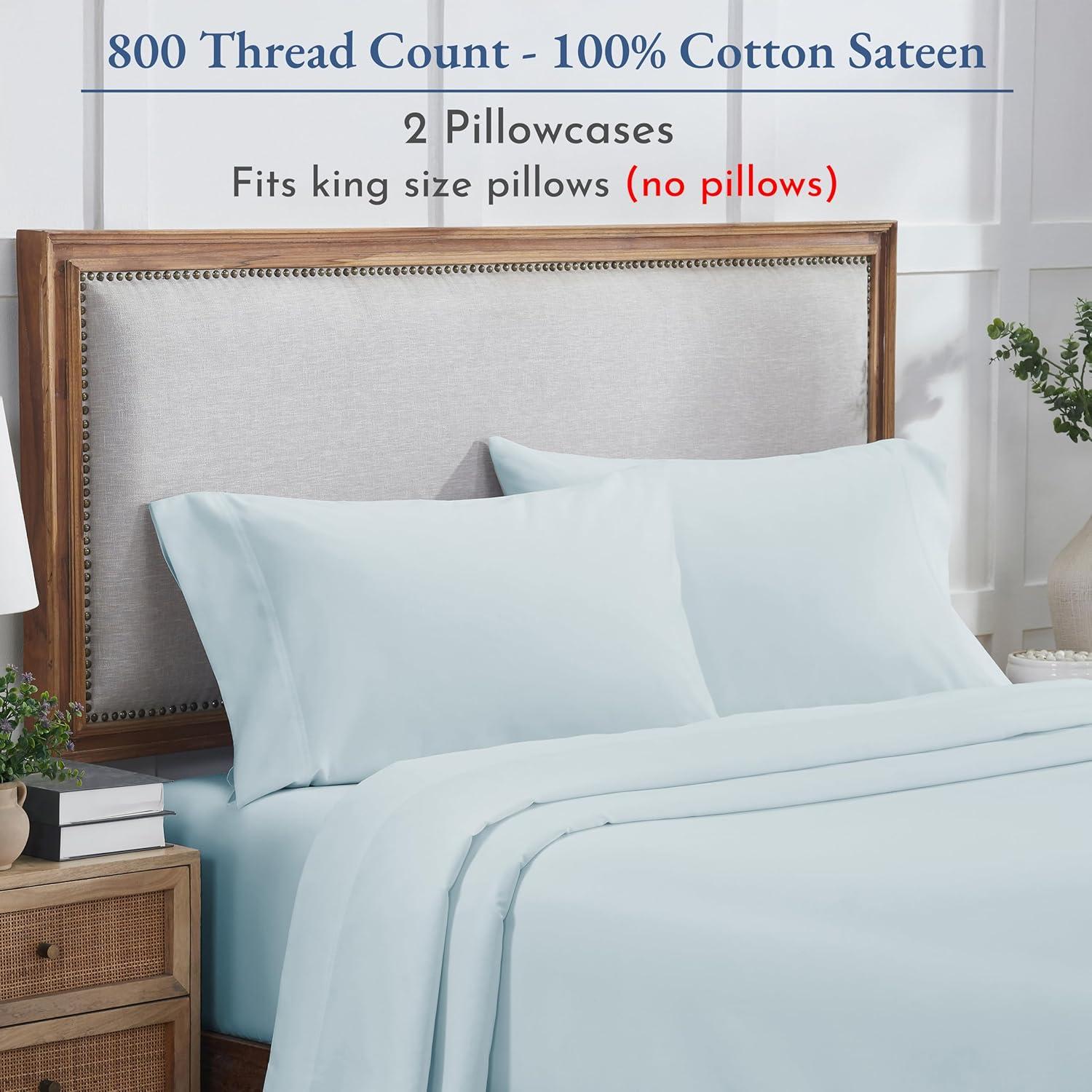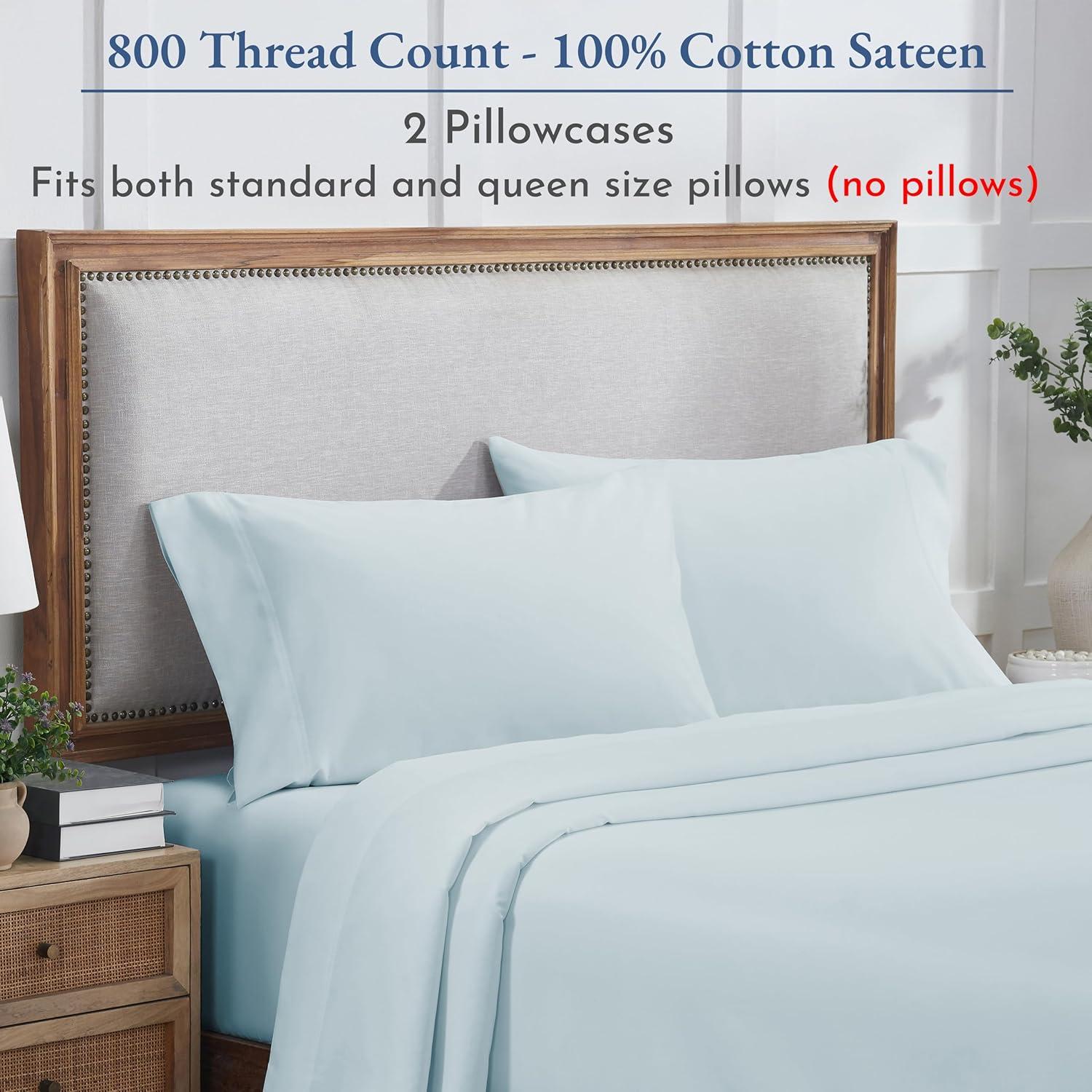 Heirloom Soft, Smooth & Thick Certified 800 Thread Count 100% Cotton Sateen is Superior to Egyptian Cotton Claims, 2 White Standard Pillowcases Fits Standard & Queen Size Pillows (Bright White)(Light Blue)