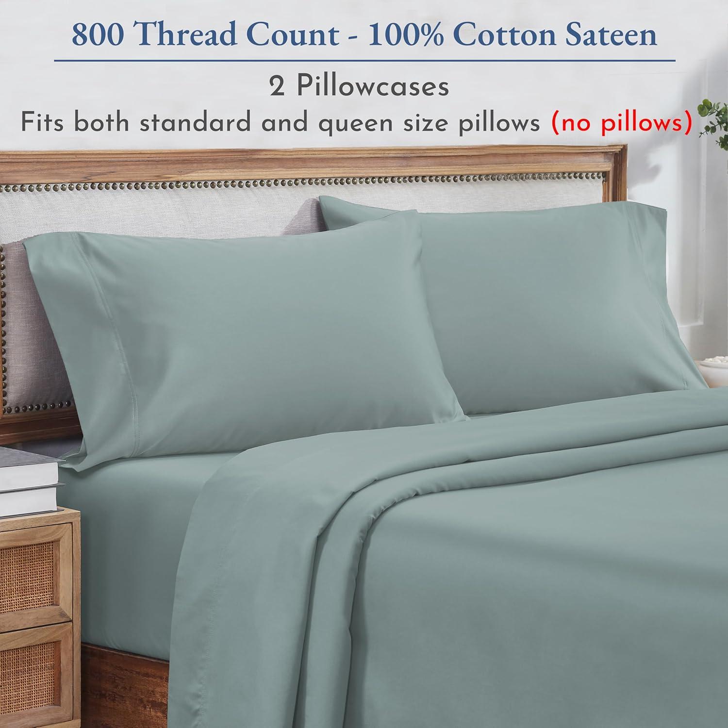 Heirloom Soft, Smooth & Thick Certified 800 Thread Count 100% Cotton Sateen is Superior to Egyptian Cotton Claims, 2 White Standard Pillowcases Fits Standard & Queen Size Pillows (Bright White)(Sage Green)